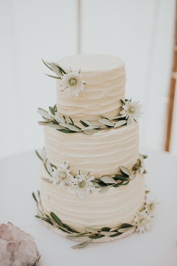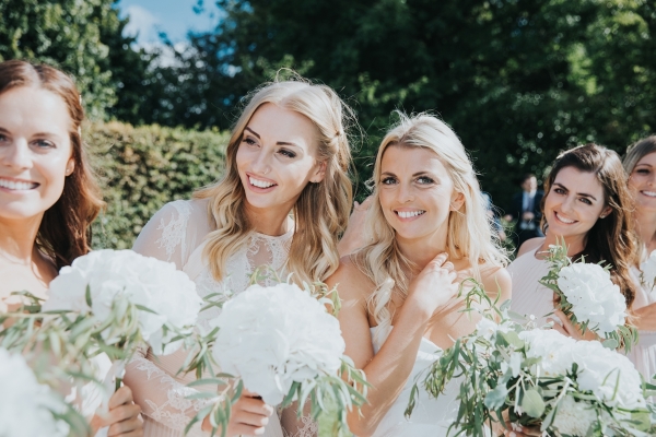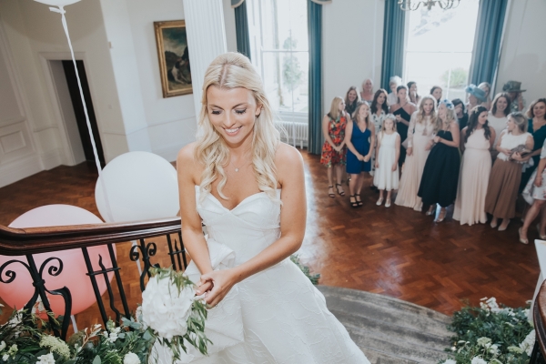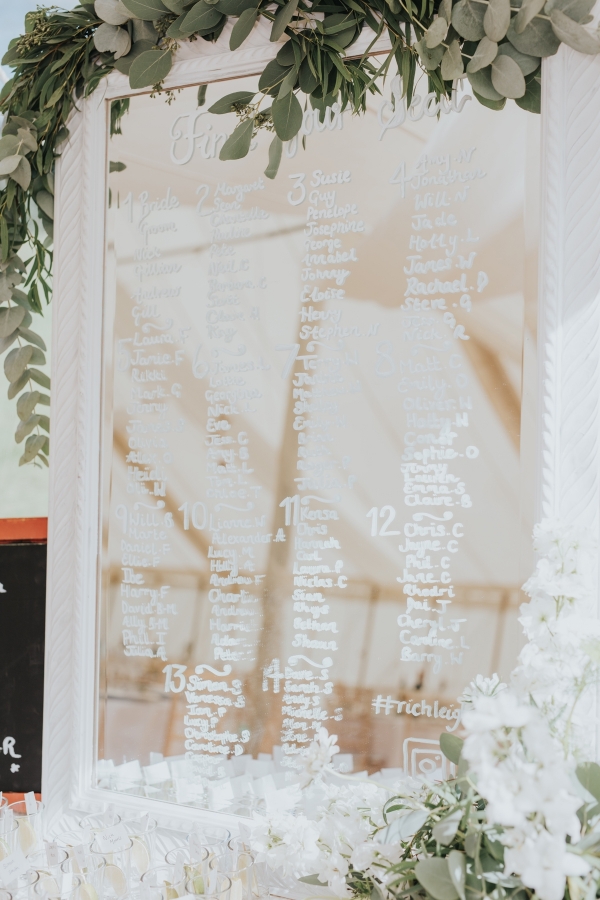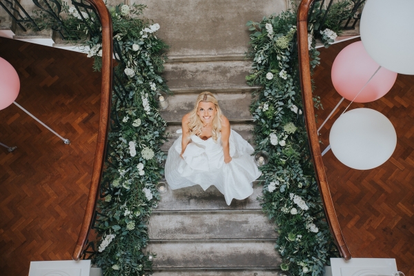 Crisp, clean and white florals adorned the venue, to complement the 'Californian outdoor wedding' theme, with a neutral colour scheme. "The trailing staircase creation, complete with candles and glass vases, was just stunning," says Leigh. "We worked with loads of eucalyptus too so the smells throughout were lovely!"