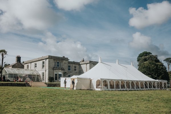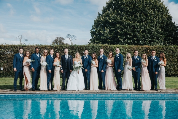 Spilling out into the sunshine after the ceremony, guests boarded double-decker buses, complete with chilled gin and tonic tins to get the party started en route to the reception at Scorrier House. A marquee in the garden meant the couple could make the most of the scenic grounds as well as the house - which housed a cocktail bar and photo booth in the main ballroom. Beautiful sunny weather meant guests were able to enjoy drinks and canapes around the outdoor pool as a jazz band played.
