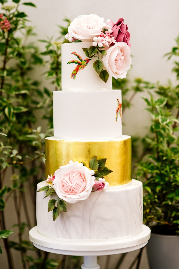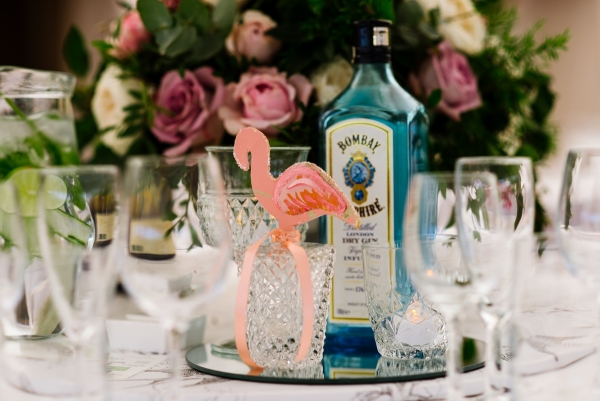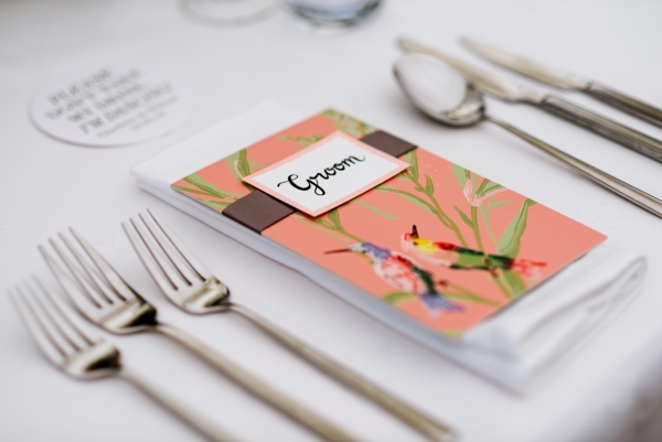 "We really wanted everything to pop, for guests to be able to feel, smell and touch," says Charlotte. The centreboards were decorated with flowers and hummingbirds, while glass plates topped with gin bottles and cut-glass goblets with candles replaced table numbers. Handwritten calligraphy cards embossed with hummingbirds and tied with ribbon made for striking table settings.