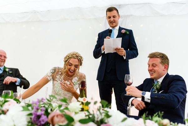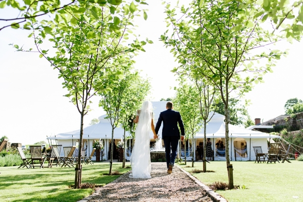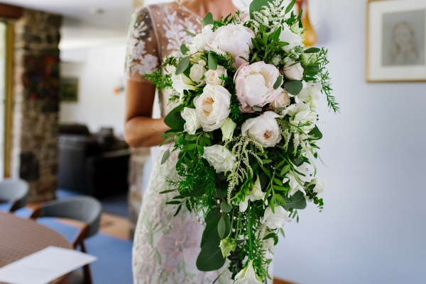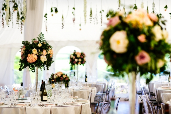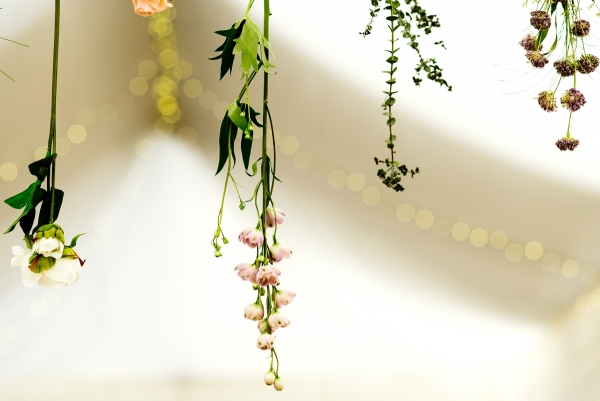 Selecting a soft colour palette of pink, purple and blue, their "English country garden romance" theme was carried via a spellbinding array of seasonal flowers from the church to the reception. Charlotte's bouquet was a cascading mix of David Austin roses, peonies, freesia and astilbe in white and creams, while hanging flowers, potted plants and large table flowers "set at different heights to give a changing aspect as you looked across the room" enabled the "garden to flow from outside to inside" at their marquee reception at Shilstone House.