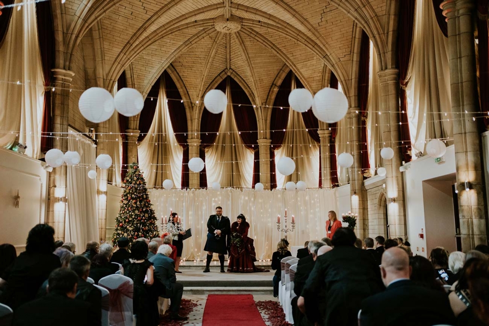 Taking an inspired Celtic/Gothic theme, the couple's winter wedding was full of personality-packed details, including kilts, a bagpiper, harpist, an optional gothic dress code, antlers and a giant two-handed sword.