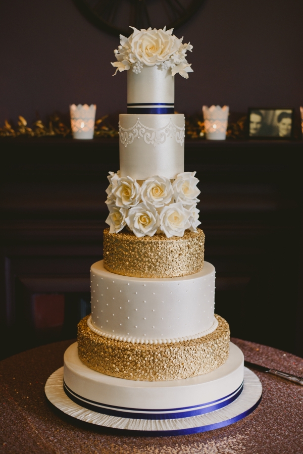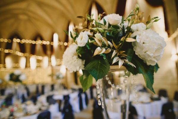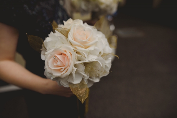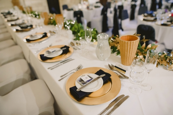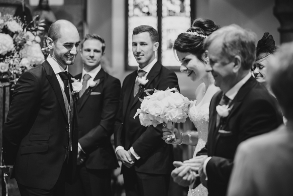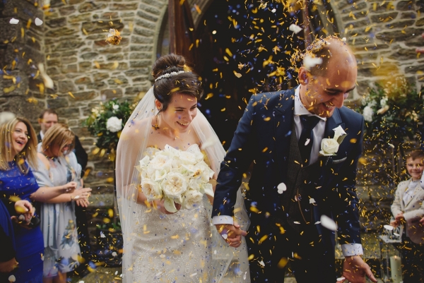 Bedecked in navy, gold and glitter, the wedding scene was a truly magical sight, featuring creamy clusters of florals and foliage, gold tableware and glittery accents throughout. In keeping with the glamorous aesthetic, Emma wore a beautifully embellished gown and carried a cream bouquet finished with twinkling detail. Ale, meanwhile, wore a coolly contemporary suit from Jack Bunneys.