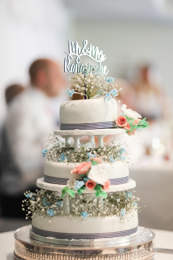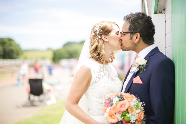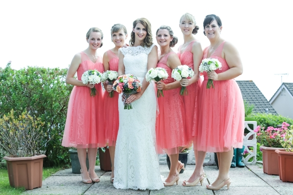 Reflecting the coastal setting of their reception venue, The Berry Head Hotel, and its stunning seascapes across Torbay, their nautical theme saw whites and creams spliced with navy blue and salmon pink. Along with pharmacy themed favours of Jagermeister in medicine bottles, the aesthetic was carried in an array of beautiful details. The bridesmaids wore salmon pink gowns, while the flowers comprised gorgeous salmon pink and coral roses combined with clouds of gypsophila, eryngium and green cymbidium orchid. "It all went together really well and was perfect for a summer wedding!" says Kate, who wore an elegant lace gown by White Rose.
