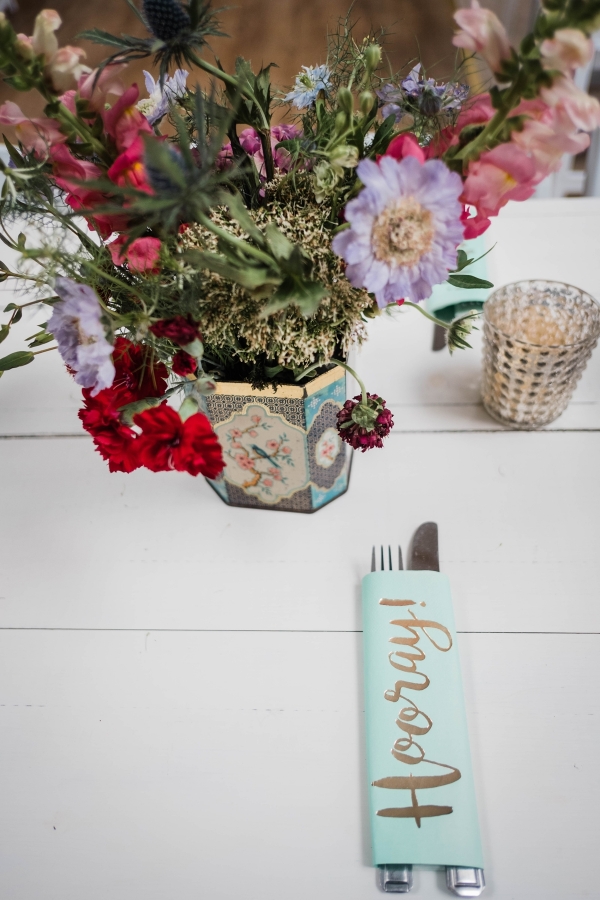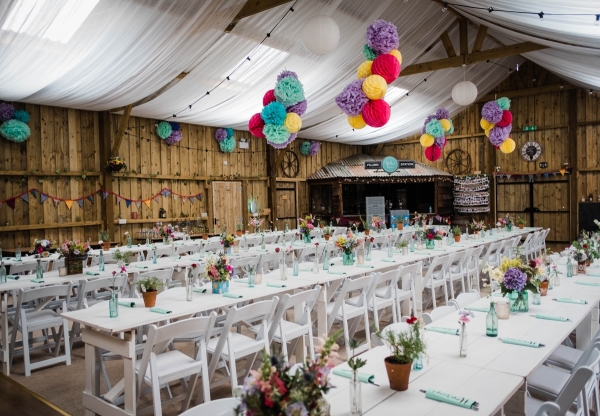 Moving on to Milton Barn for their reception, Emma and Jamie created a pom-pom extravaganza for their carnival-style wedding. "I had seen a lot of pictures of wild looking flowers in vintage bottles and tins - and pom-poms! - and just thought that that was such an elegant, vintage look but also lots of fun and really pretty. I formed a 'pom-pom team' for the day before and somehow they just created exactly what we wanted. It was actually even more beautiful than I could have believed possible!" says Emma. "To see everyone's reactions when they went into the barn was such a special moment and made all the planning so worthwhile."