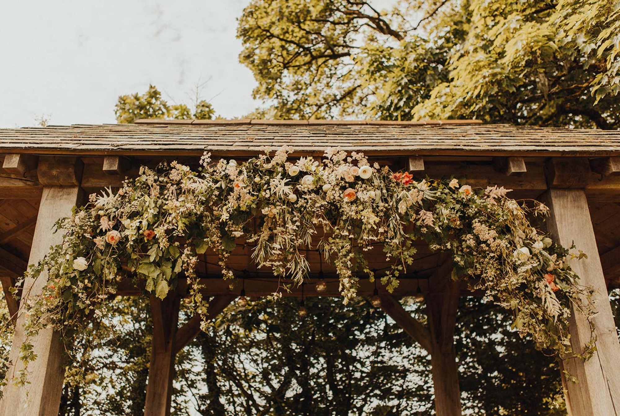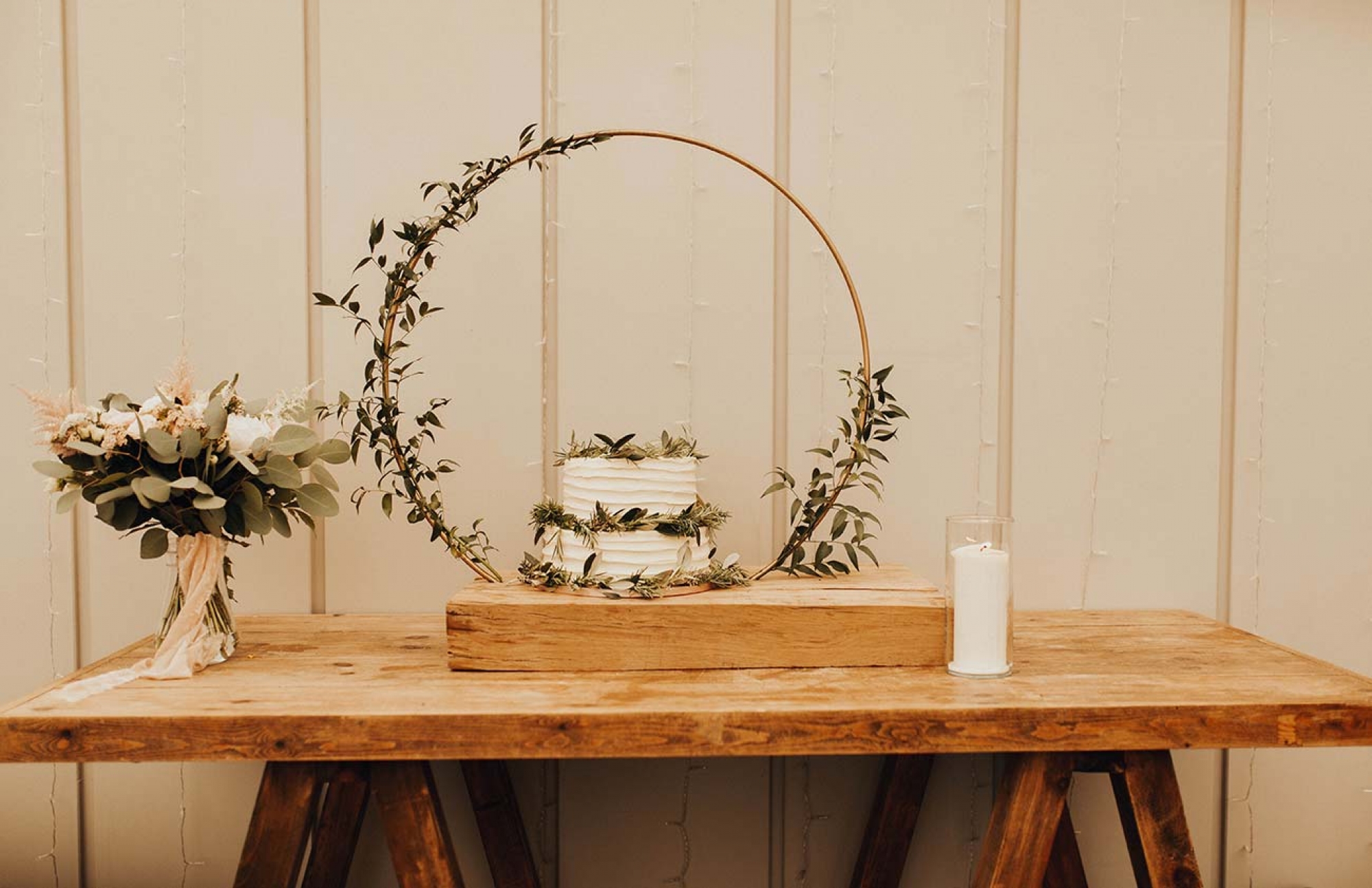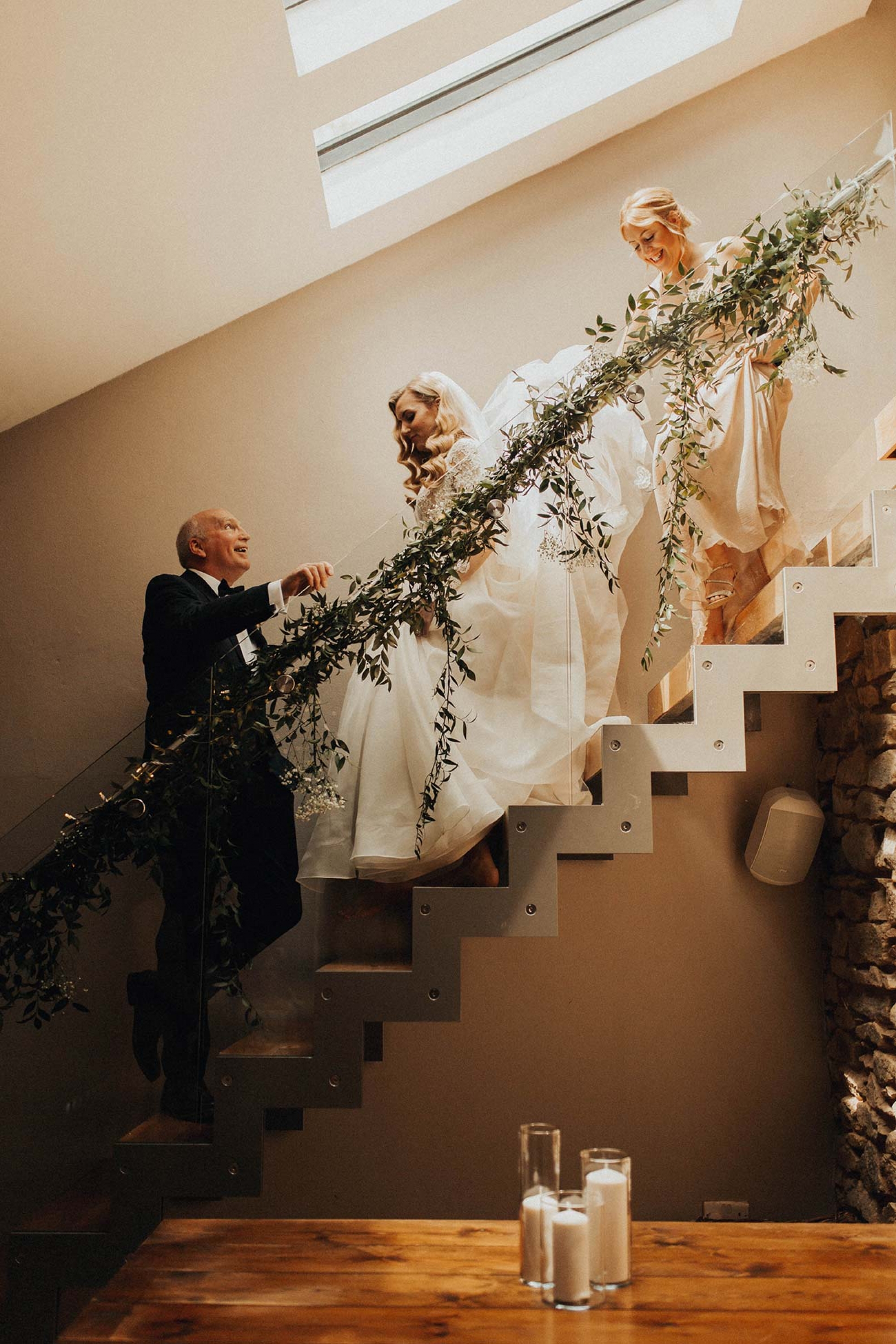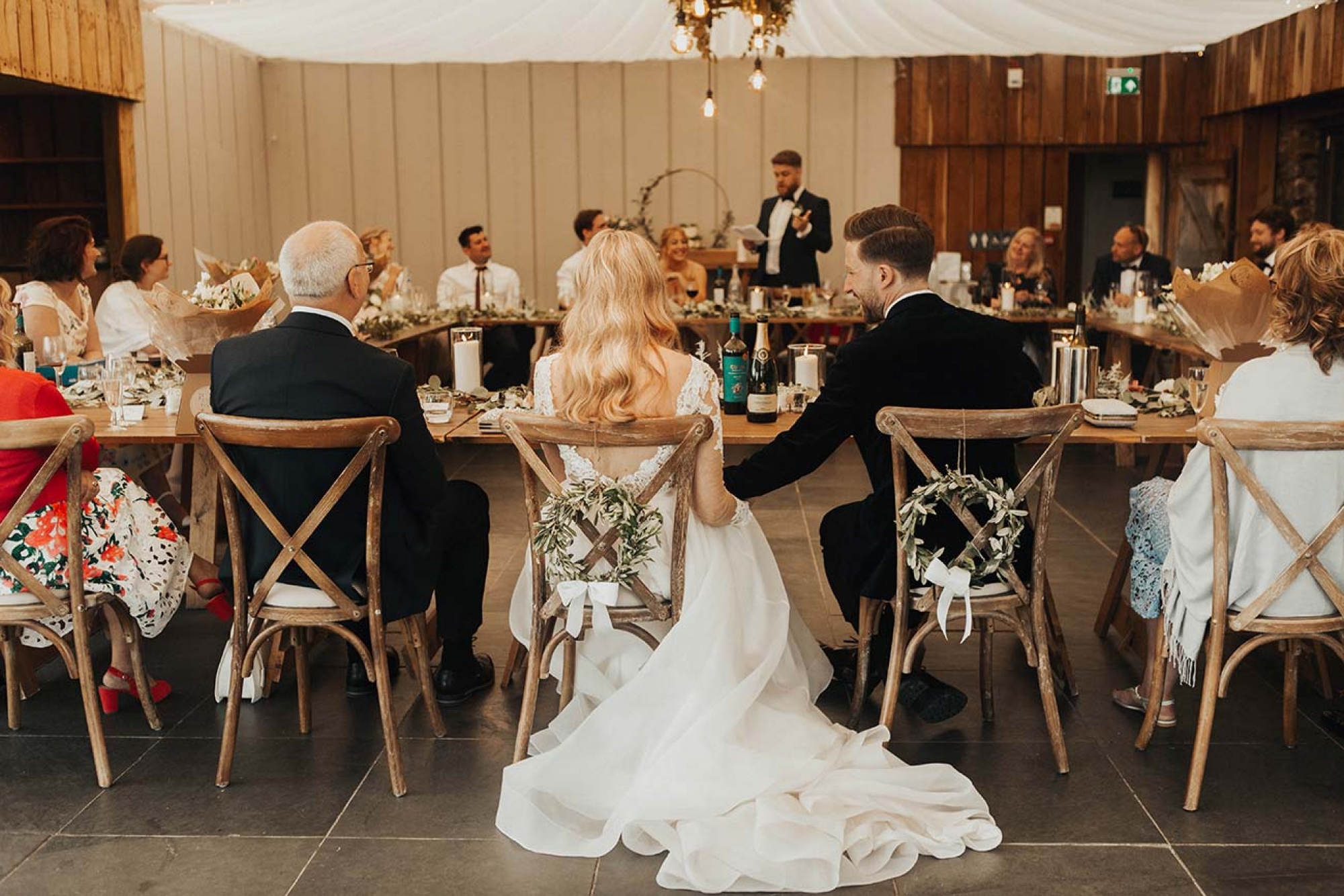 The floristry was one of the most evocative aspects of the day, with Emily's stunning bouquet of Juliet David Austin roses, white ranunculus, peonies and mixed country foliage paired with beautiful buttonholes of delicate peach lisianthus, ranunculus, white veronica and eucalyptus cinerea wrapped in rustic twine. The decor featured many of the same florals, in addition to ivy trails for the arbour, hanging ladder, staircase and trestle tables, while olive wreaths adorned the back of the couple's chairs to eye-catching effect.