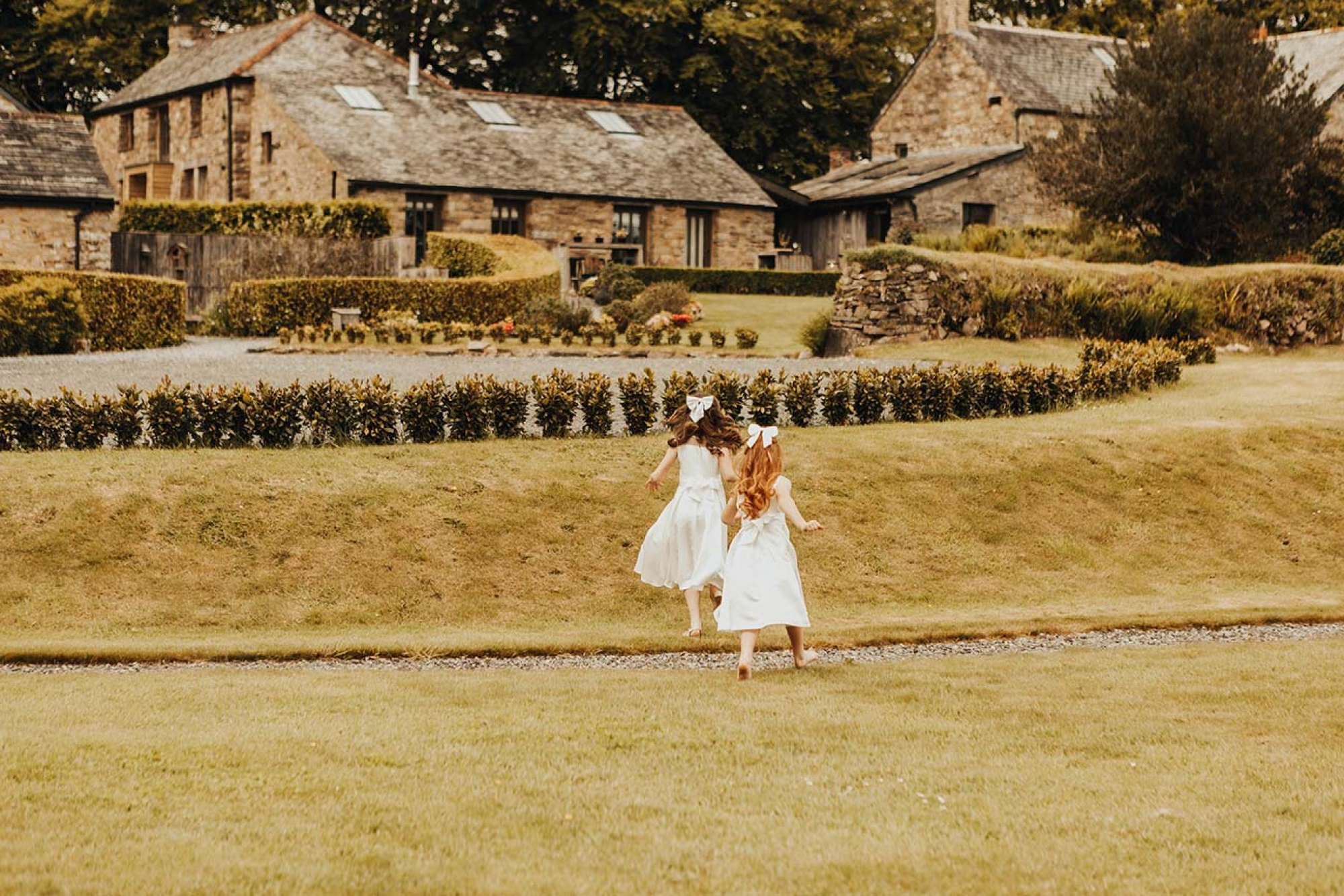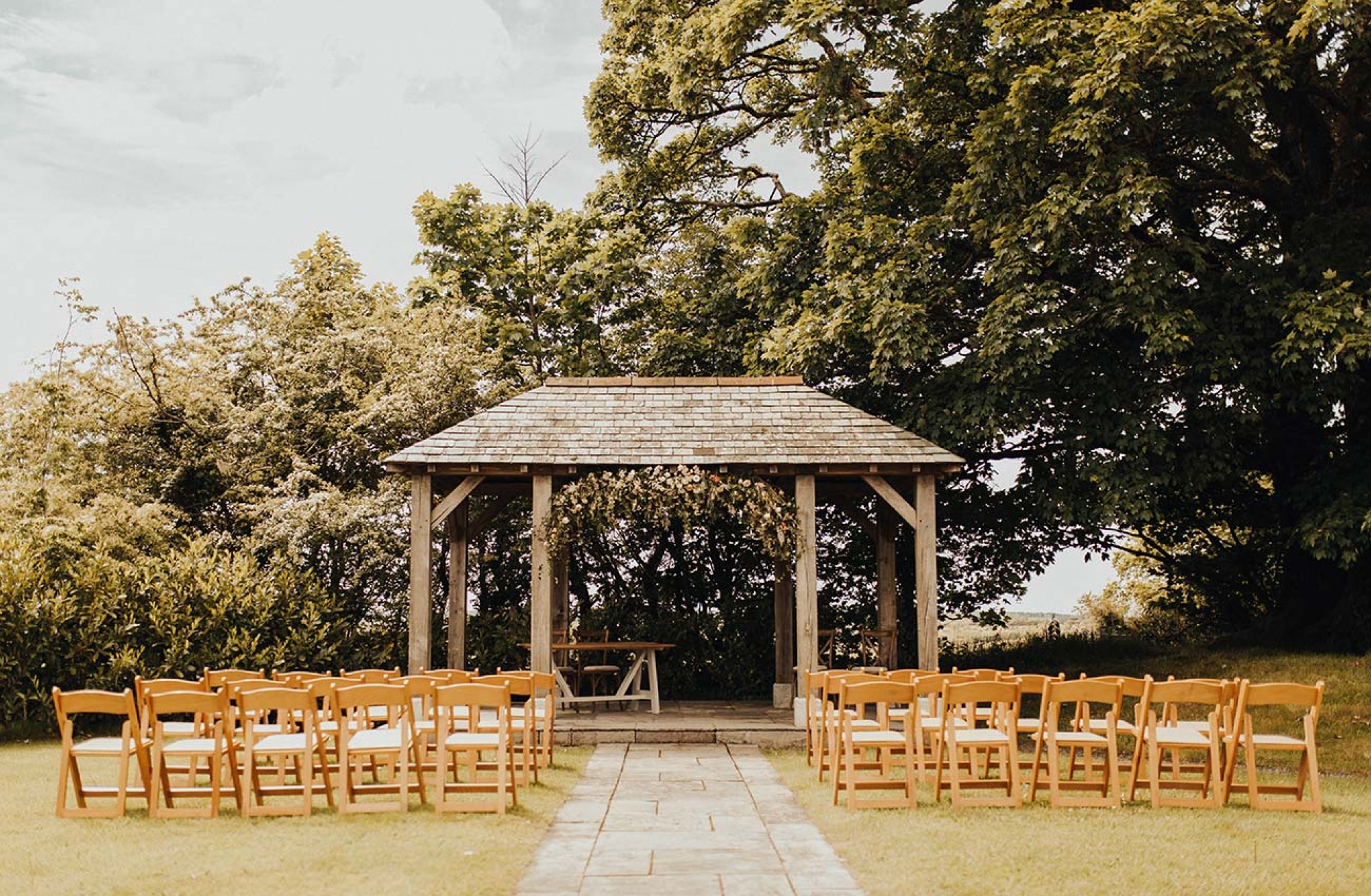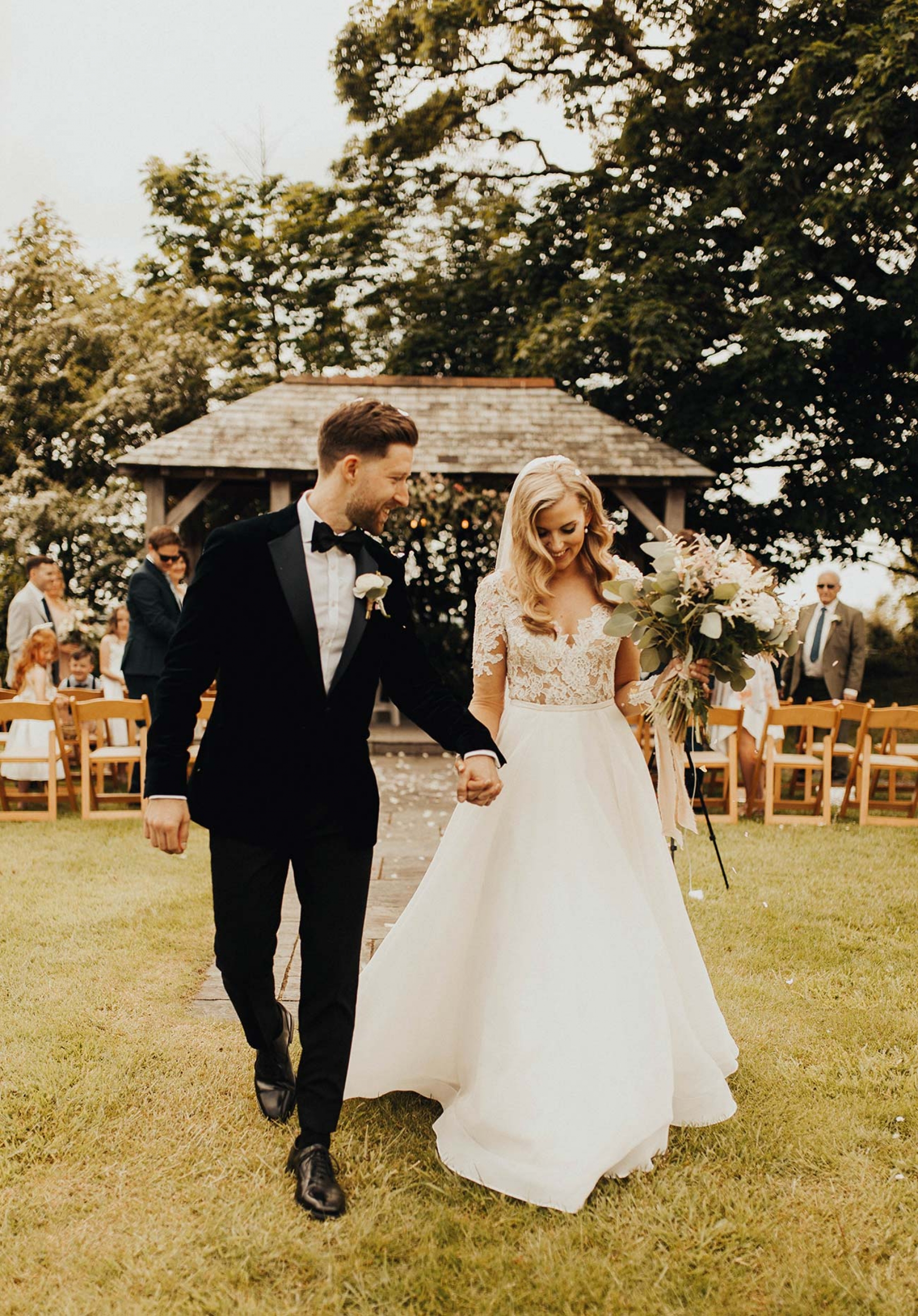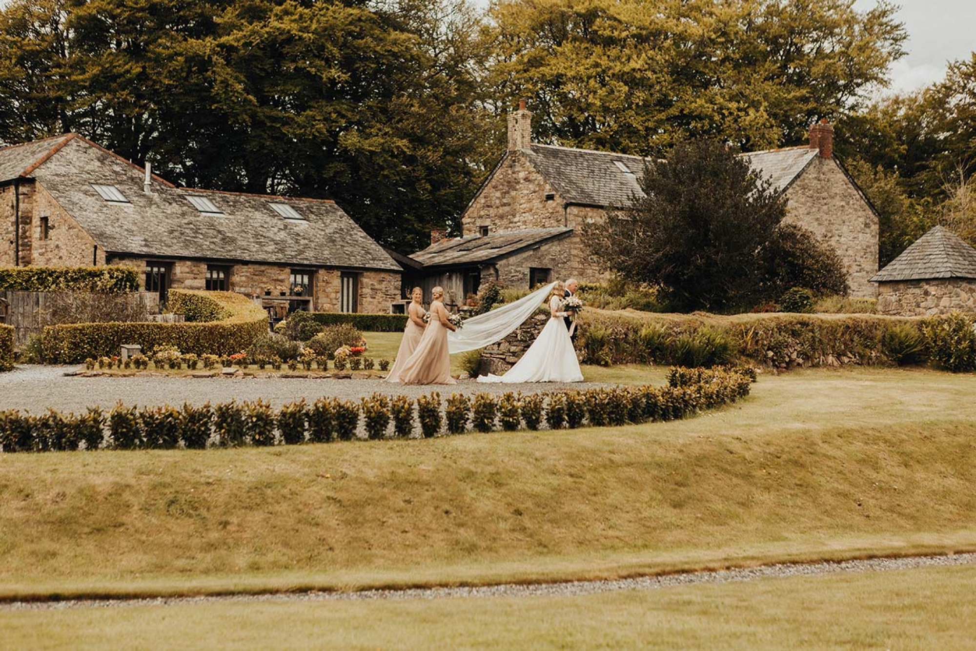 The floristry was one of the most evocative aspects of the day, with Emily's stunning bouquet of Juliet David Austin roses, white ranunculus, peonies and mixed country foliage paired with beautiful buttonholes of delicate peach lisianthus, ranunculus, white veronica and eucalyptus cinerea wrapped in rustic twine. The decor featured many of the same florals, in addition to ivy trails for the arbour, hanging ladder, staircase and trestle tables, while olive wreaths adorned the back of the couple's chairs to eye-catching effect.