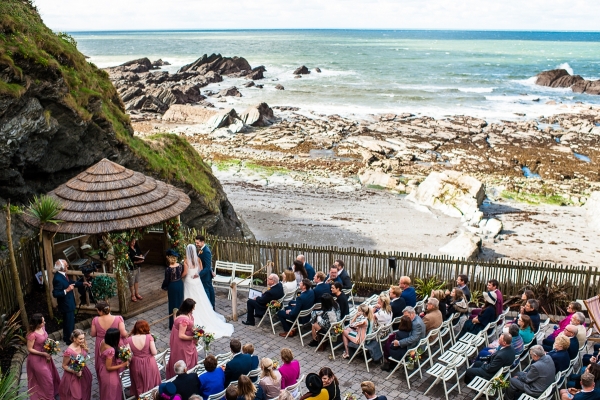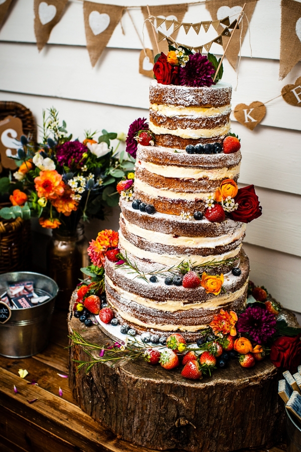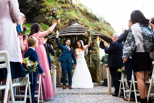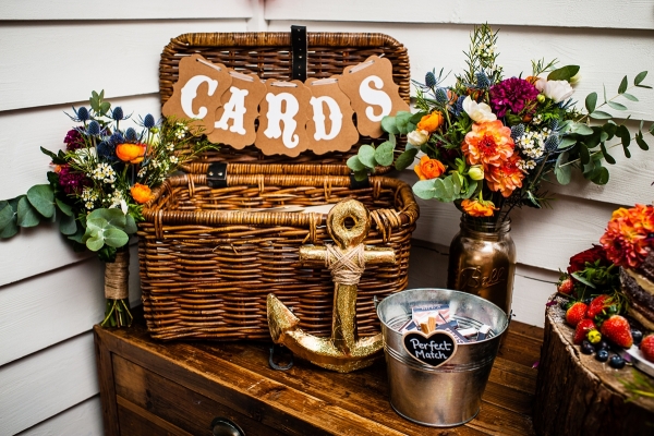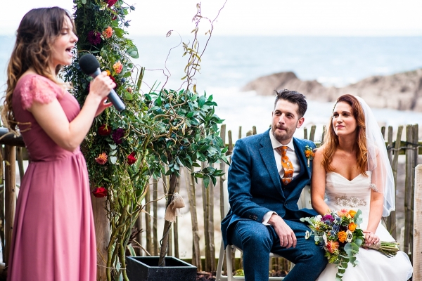 From the capital to the coast of North Devon, the couple chose to marry at the breathtaking seaside setting of Tunnels Beaches, which inspired a plethora of nautical and vintage touches woven together with autumnal shades of rusty pinks, reds and oranges. The rich palette carried from the flowers and groom's accessories through to the naked cake topped with fruits and flowers.