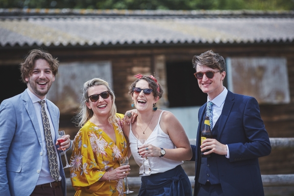 Drinks, canapés and garden games entertained guests during the post-ceremony celebrations, which were followed by a two-course picnic basket-style wedding breakfast featuring 'posh' sausage rolls, duck and plum scotch eggs, pâté, mini cheese boards and salads. Dessert comprised miniature scones with cream and jam, and lemon posset, while a brownie tower made by Abi was served as the wedding cake.