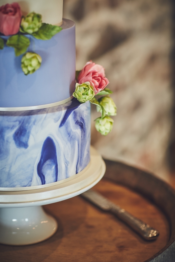 As the evening guests arrived, it was time to cut the cake - a three-tiered marvel that included a Victoria sandwich covered in navy marbled icing, a coffee sponge with Baileys buttercream and cornflower blue icing, and a traditional fruit cake with ivory icing. "It was all decorated with pink sugar tulips and hop cones - to indulge Julian's love of beer!" says Clare.