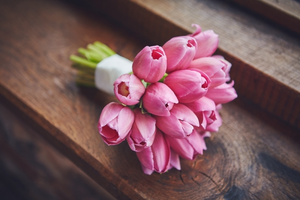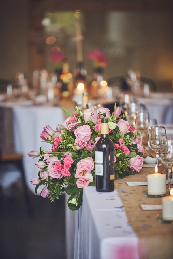 "Julian is a bit of a craft beer geek," says Clare. "Our central arrangement consisted of church candles and beer bottles of different sizes, wrapped in jute twine, which we used as vases for our hand-cut pink tulips."