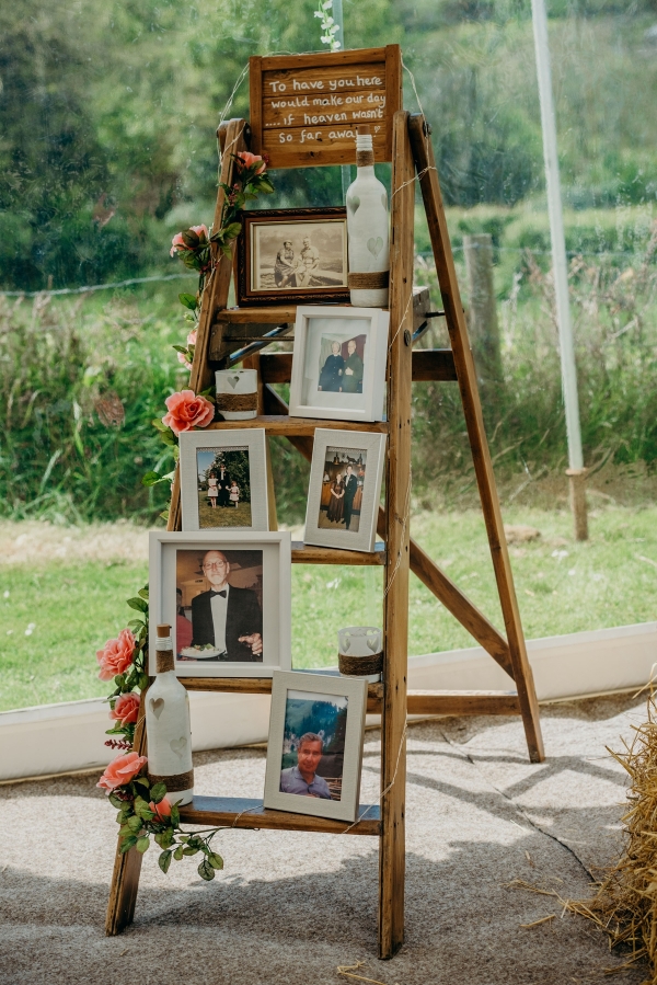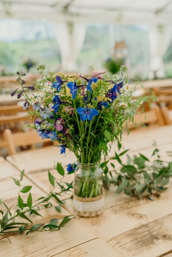 Echoing the mood, the floristry was a simple yet striking medley of colourful wild flowers and foliage: Jo's bouquet included matricaria daisies, freesias, gypsophila and rosemary, while the bridesmaids clutched bunches of daisies and the tables were dotted with jam jars of yellow freesia, purple stocks, blue delphinium, solidago and clematis. The arrangements perfectly complemented the wooden decor and props made by Jo's aunt, including an oversized photo frame, wooden games, memory ladder with pictures of lost loved ones and blanket holder.
