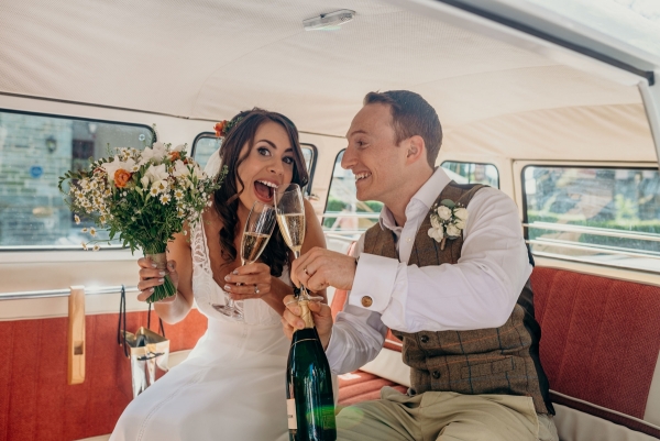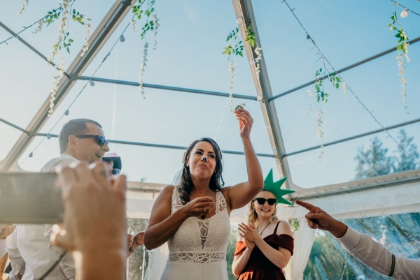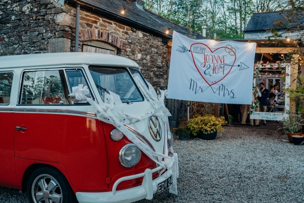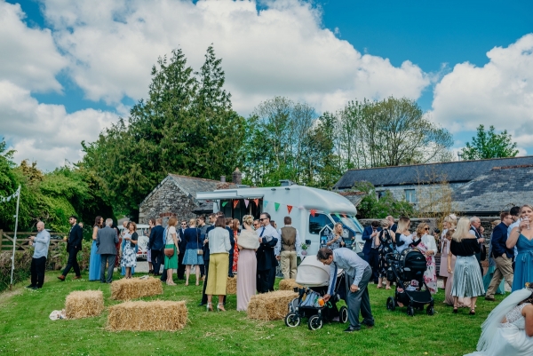 Following their first journey together as husband and wife in a VW camper stocked with Moet, the newly-weds arrived at Wonwood Barton to take in one of their favourite memories from the day. "It was so nice to look around seeing everyone enjoying the free bar and the homemade games my talented auntie had made like stilts and the hoop game," recalls Jo.