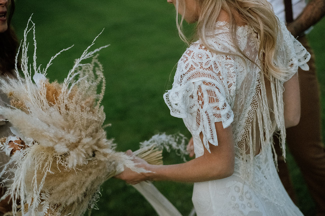 Nestled in a tranquil valley, Camel Studio was the romantic backdrop for their boho styled wedding which had nods to rock ‘n’ roll throughout. Opting for a pared-back palette of creams, beiges and browns, Sophie’s bespoke vintage patchwork lace gown epitomised the look of their outdoor wedding. Her bridesmaids teamed their cream dresses with bouquets of dried blooms, while the groom’s party carried the palette and mood with their relaxed attire featuring brown trousers, braces and bow ties.
