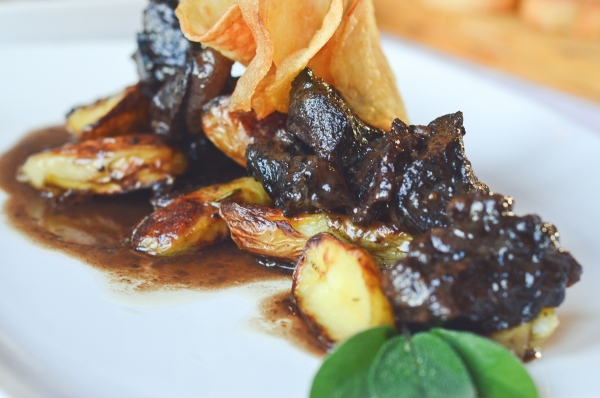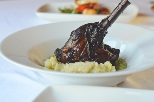 Served with crushed minted new potatoes, garlic and lemon crushed pea puree, finished with a rich, dark molasses lamb stock gravy