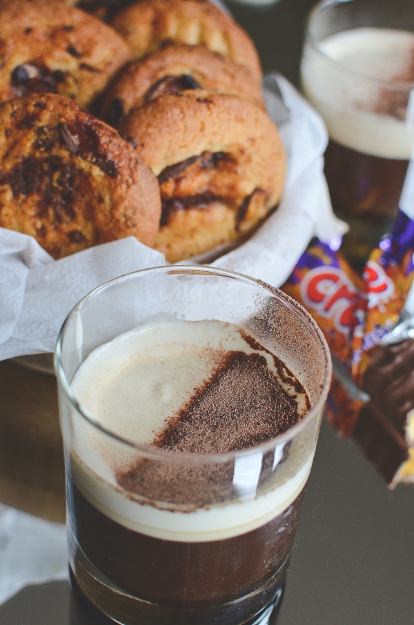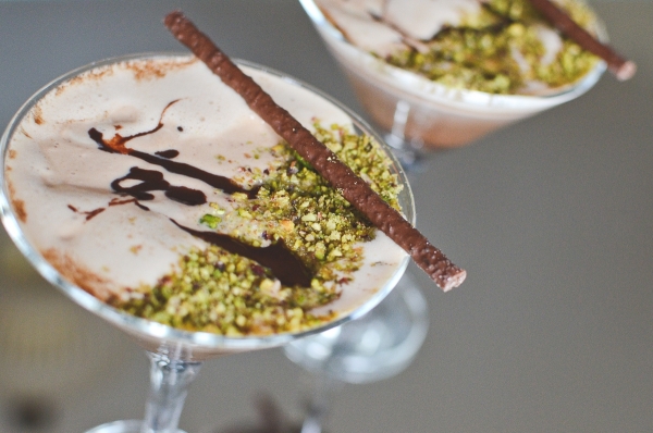 Tia Maria and chocolate liqueur with Baileys cream and chocolate shards, served with a white chocolate mousse scoop