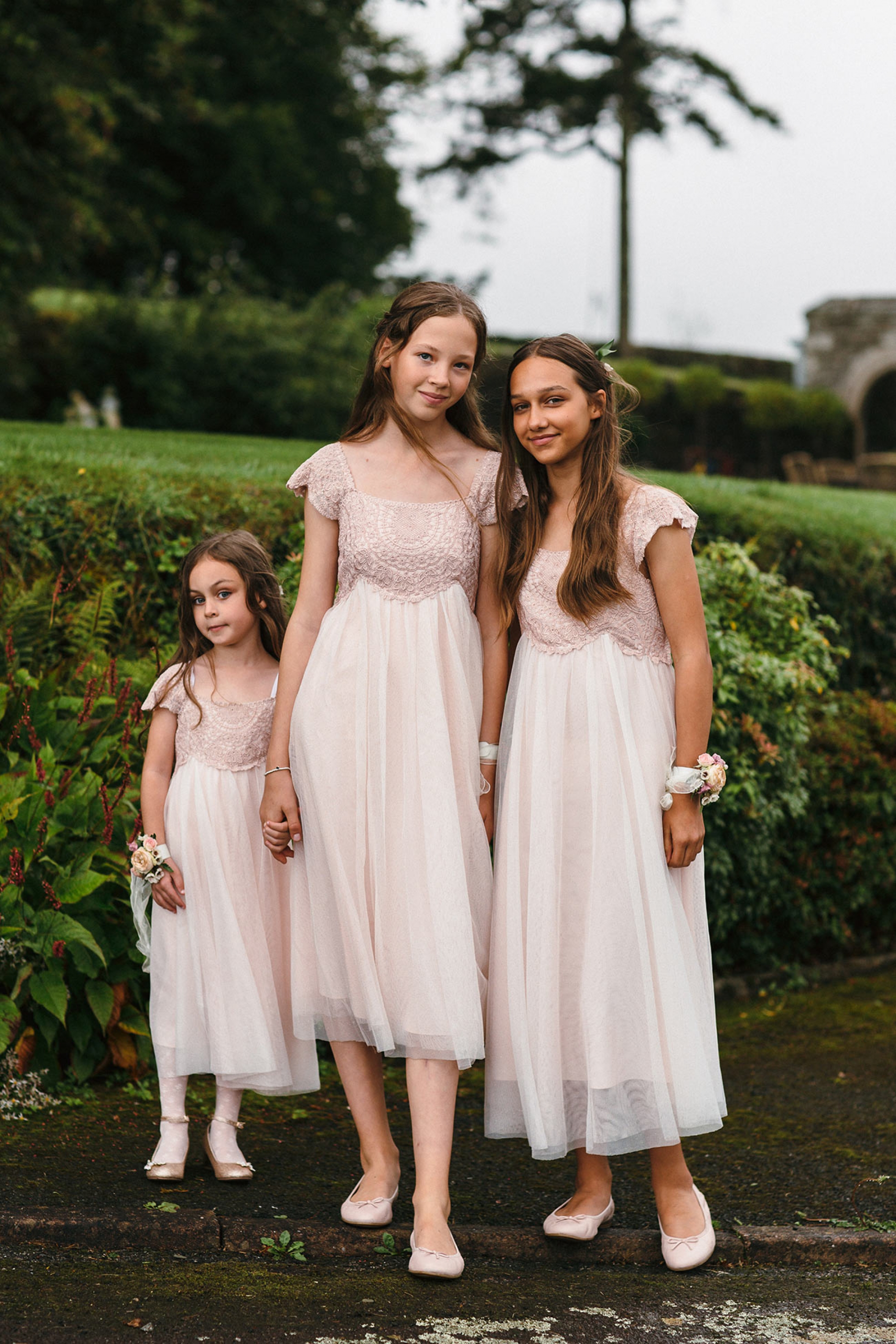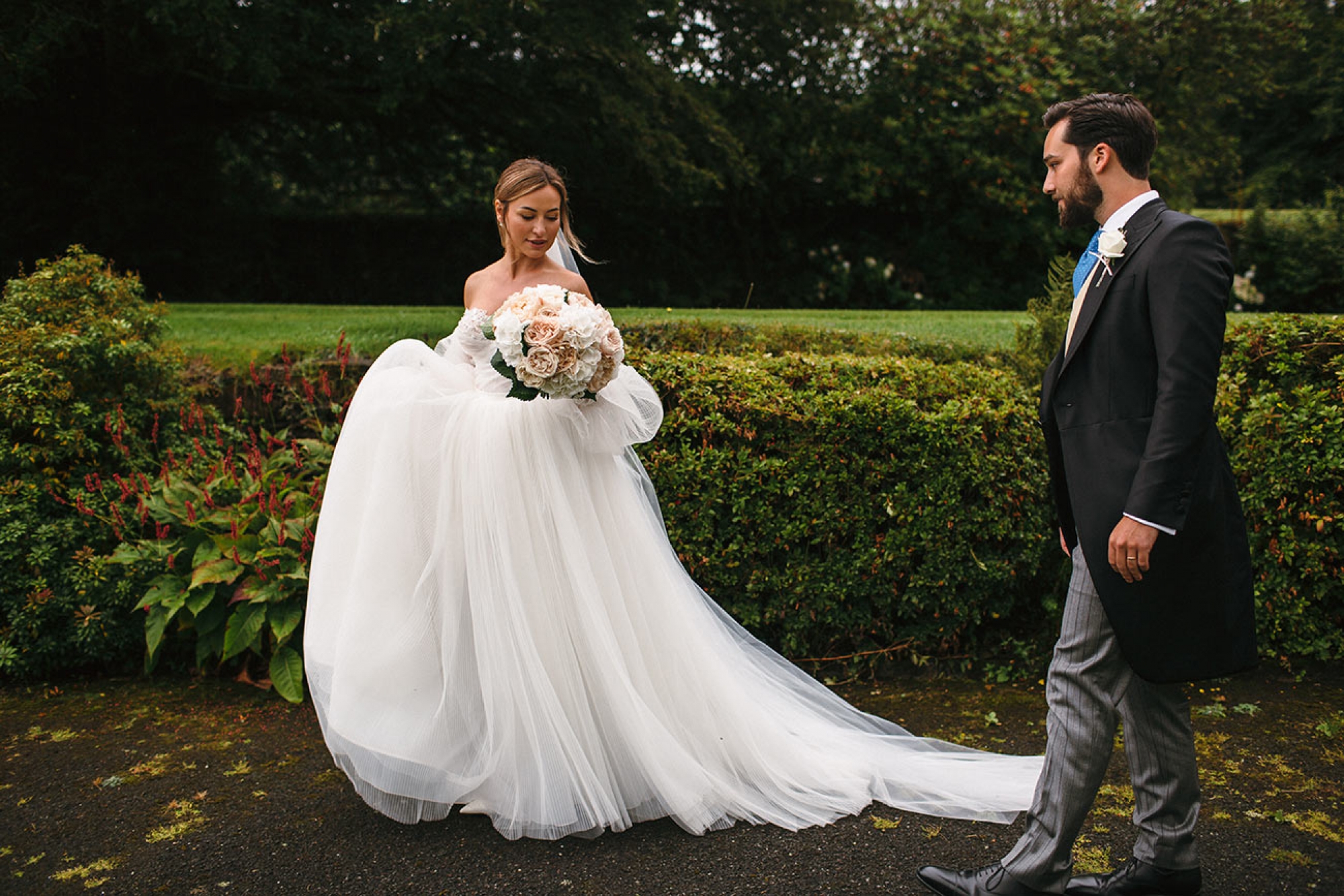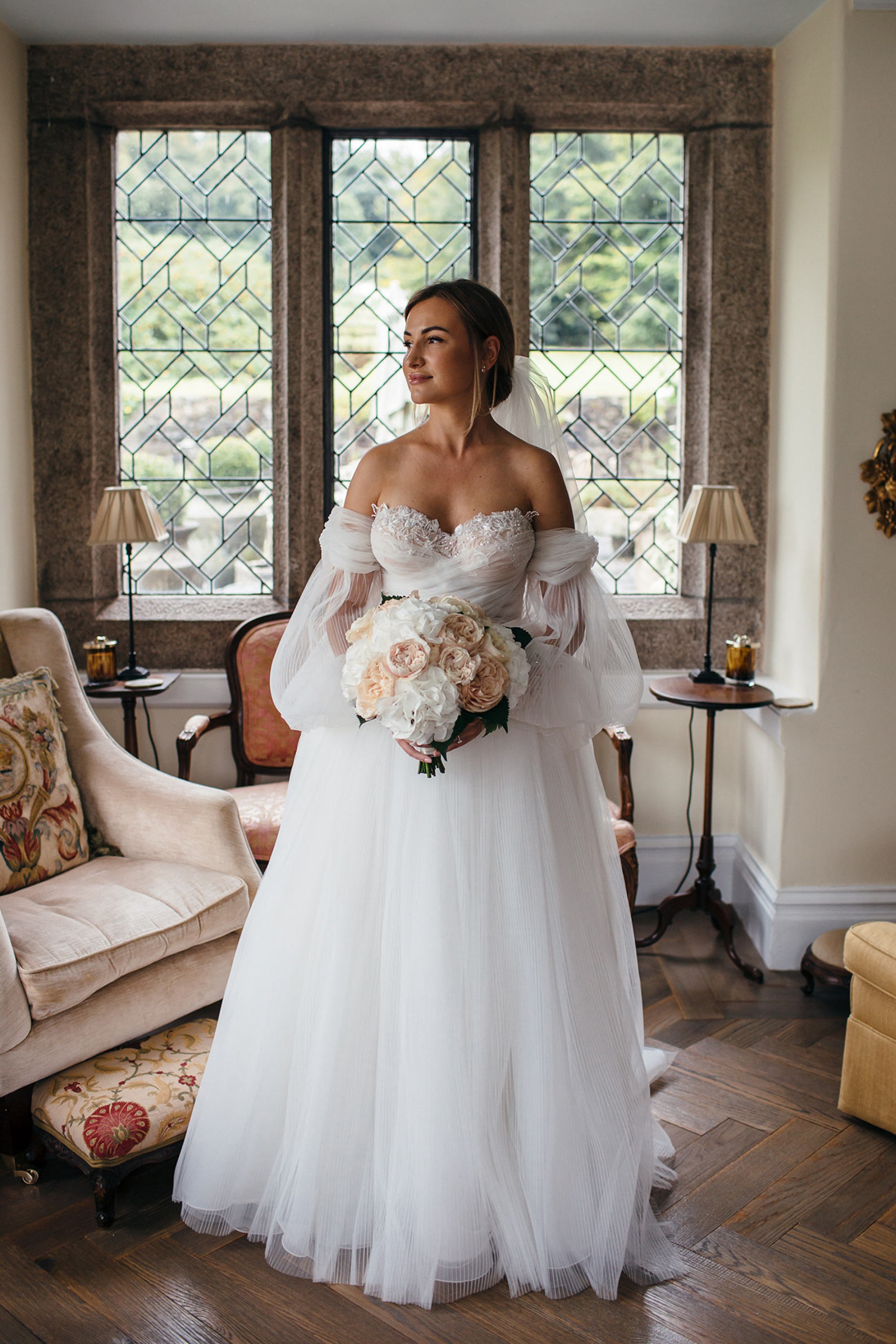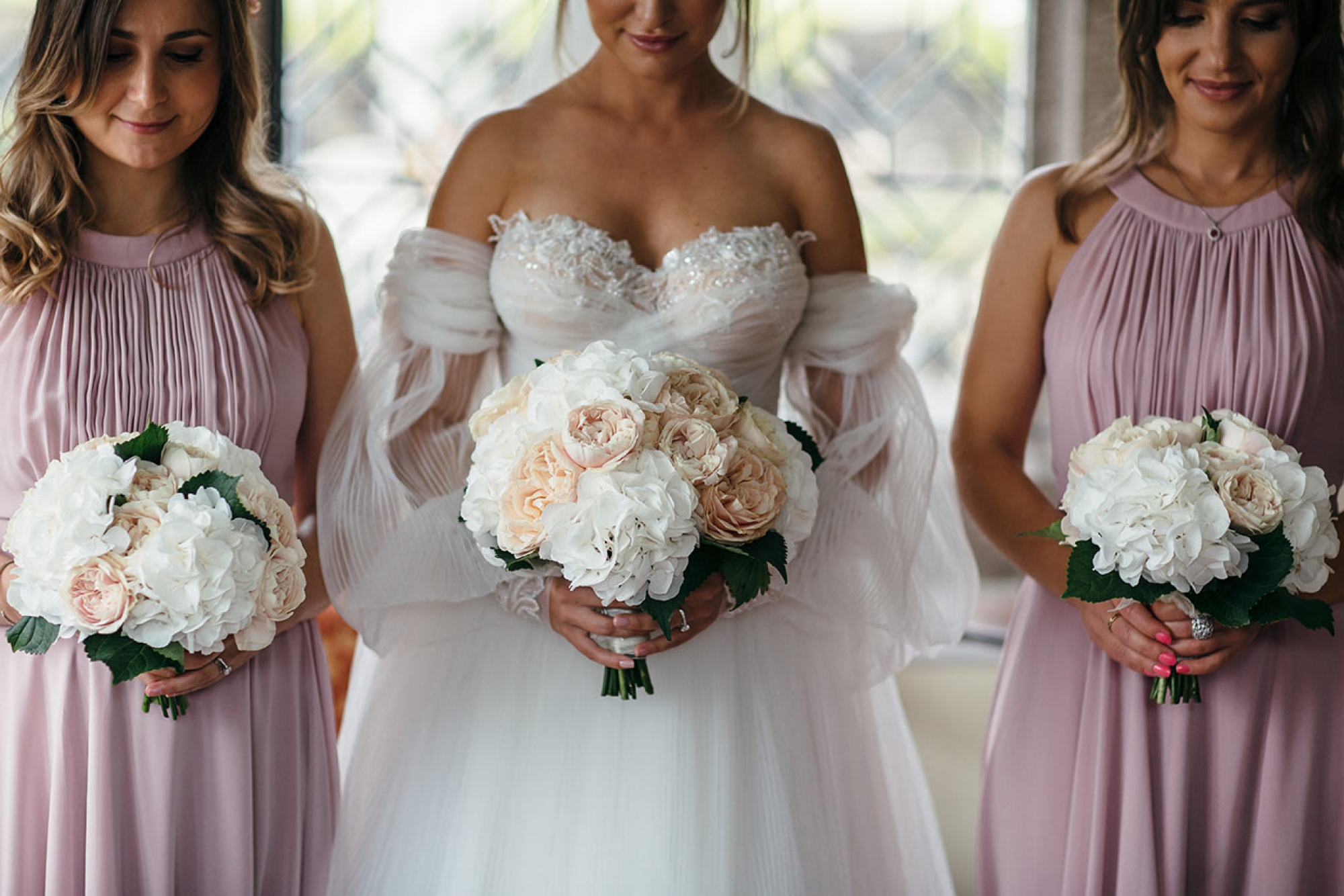 Cristina’s bridal gown – a stunning design made in Moldova with layers of soft tulle and statement sleeves – evoked the day’s romantic aesthetic beautifully. The soft pink bridesmaids’ dresses harmonised with the bouquets of barely-there shades, while Rupert carried a classic look in a bespoke morning suit.