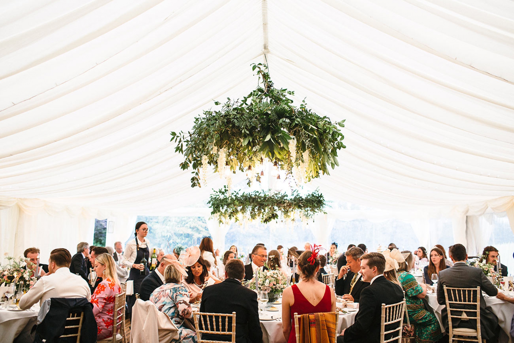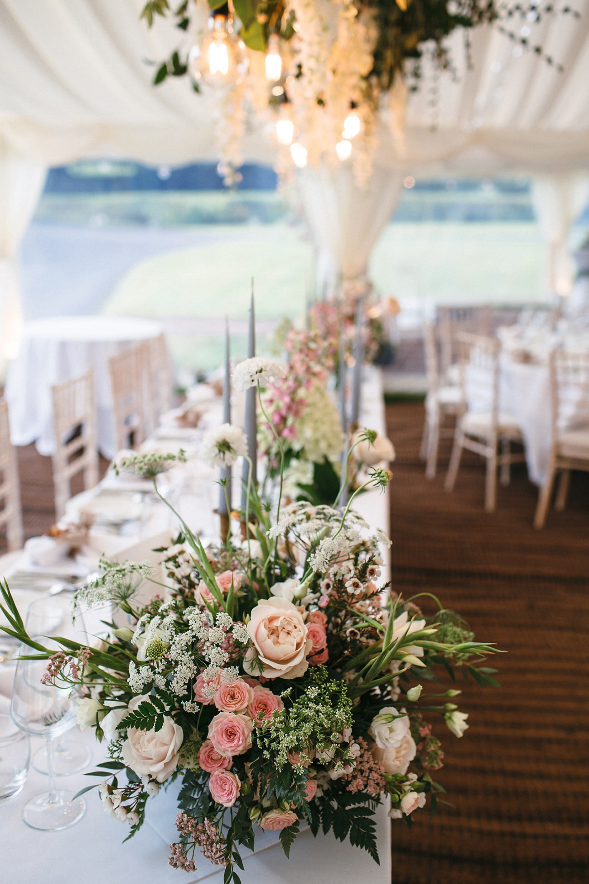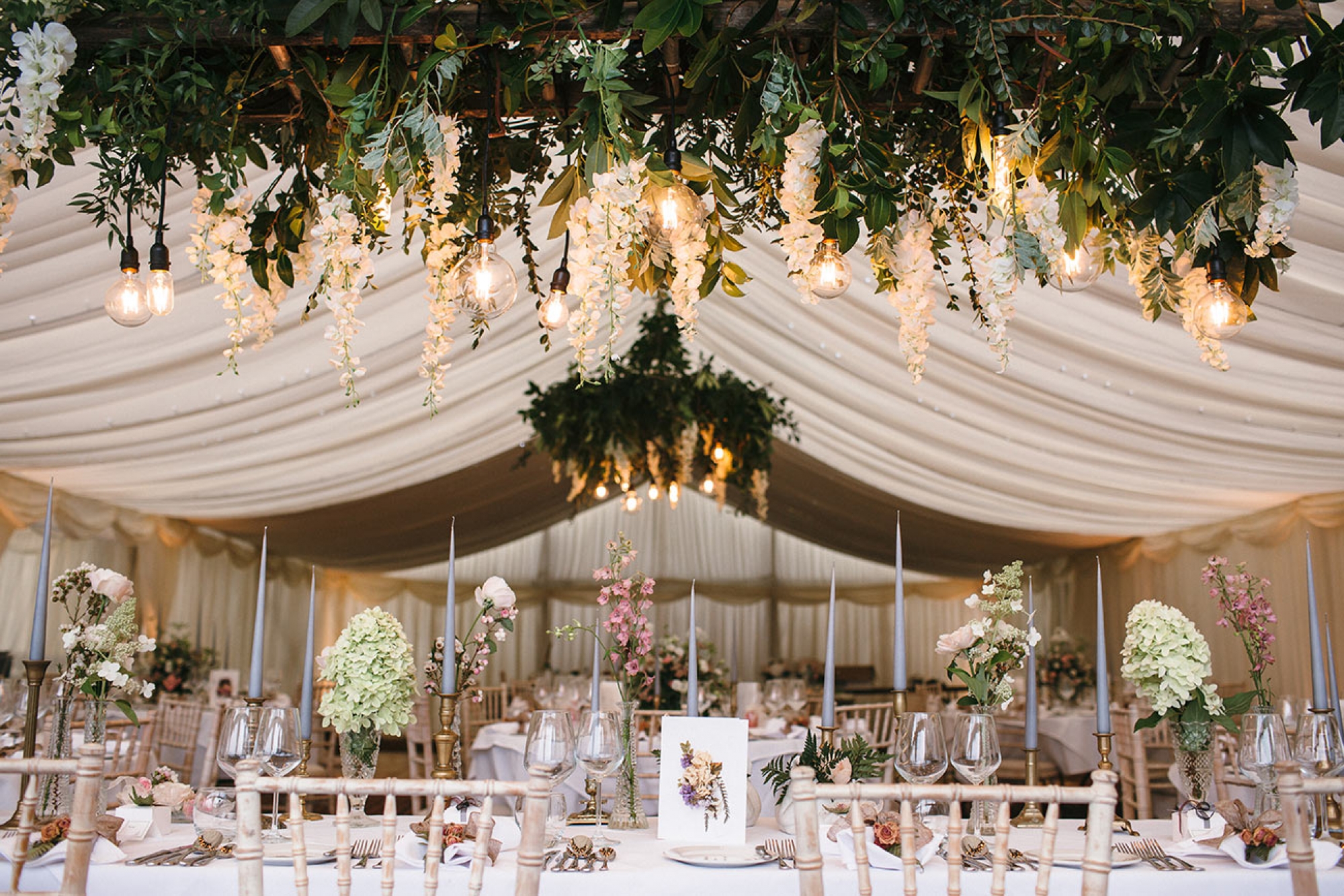 Styled with a palette of white, sage green and blush pink, the marquee harmonised perfectly with the scenic setting of Hurlditch Court. “We wanted something classic with a very slight country feel,” explains Cristina. Gorgeous hanging foliage and florals, together with candlelit tables adorned with arrangements of dainty blooms, made for a dreamily romantic scene.