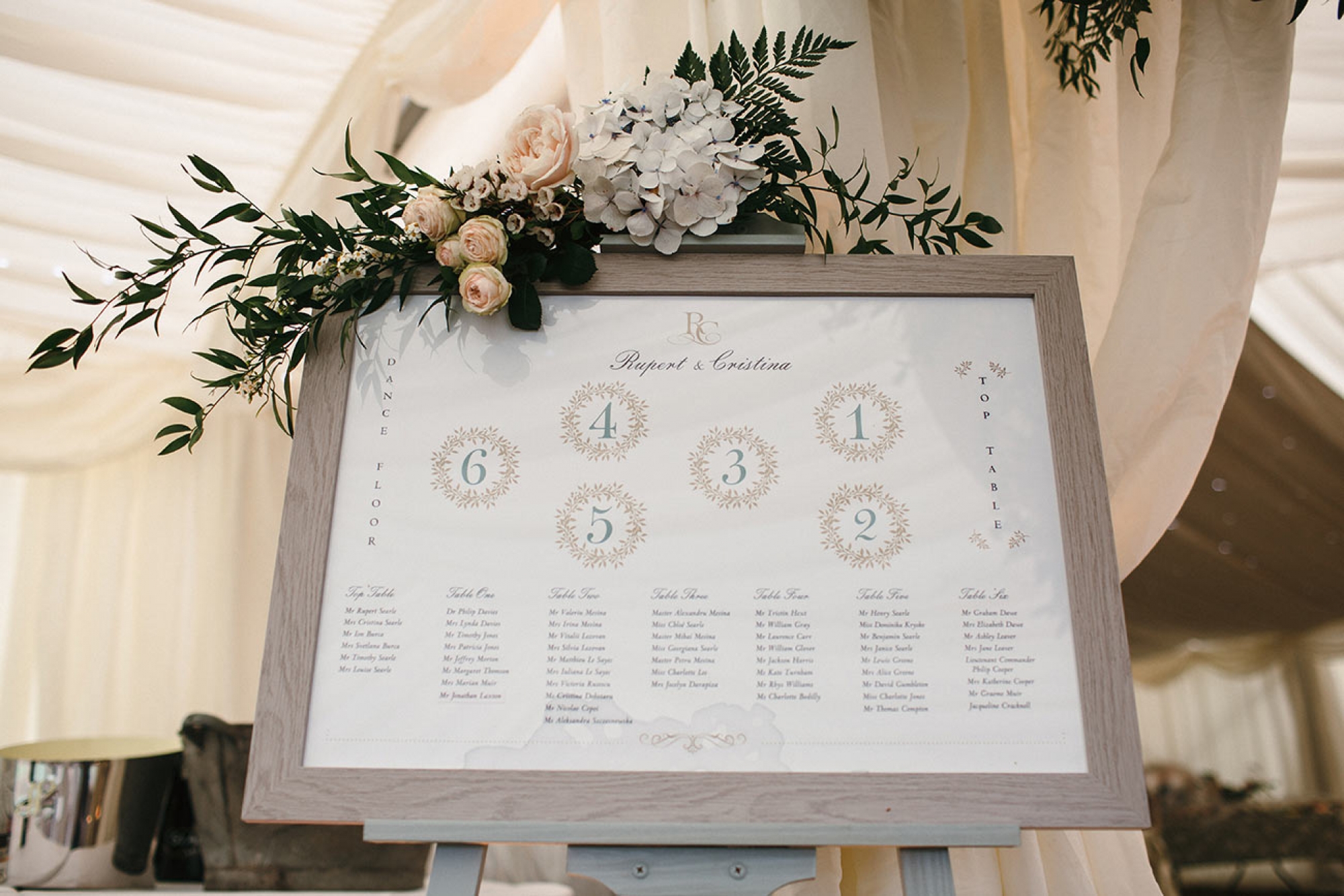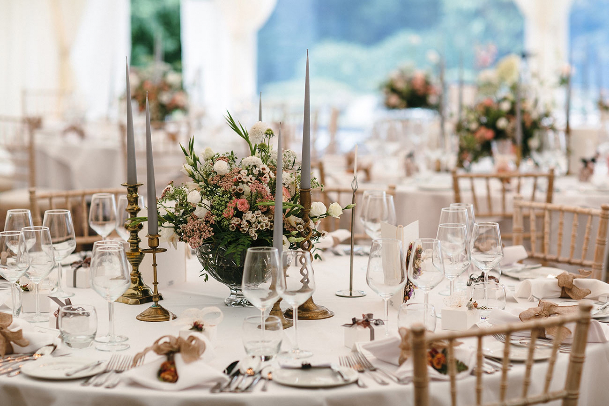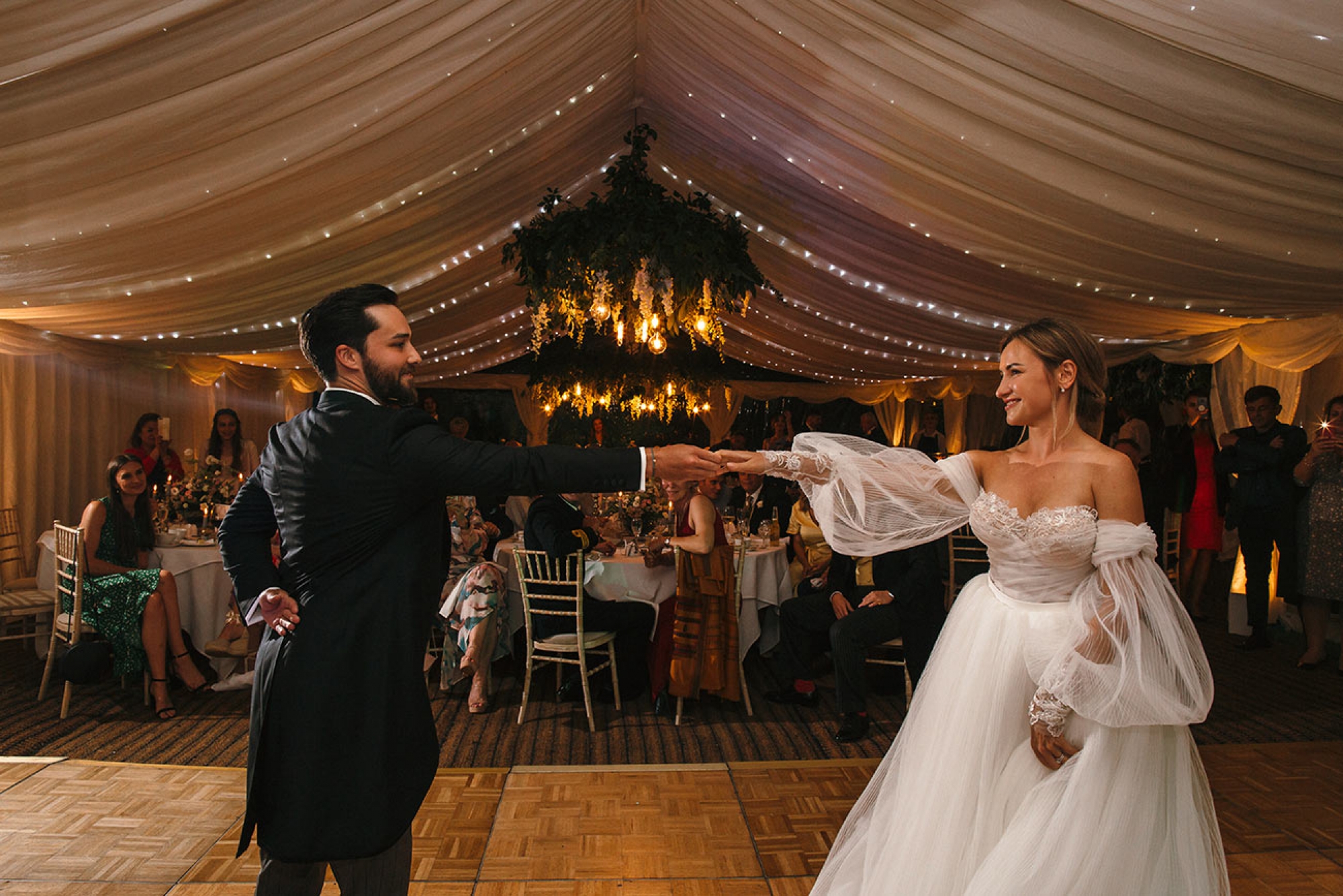 Styled with a palette of white, sage green and blush pink, the marquee harmonised perfectly with the scenic setting of Hurlditch Court. “We wanted something classic with a very slight country feel,” explains Cristina. Gorgeous hanging foliage and florals, together with candlelit tables adorned with arrangements of dainty blooms, made for a dreamily romantic scene.