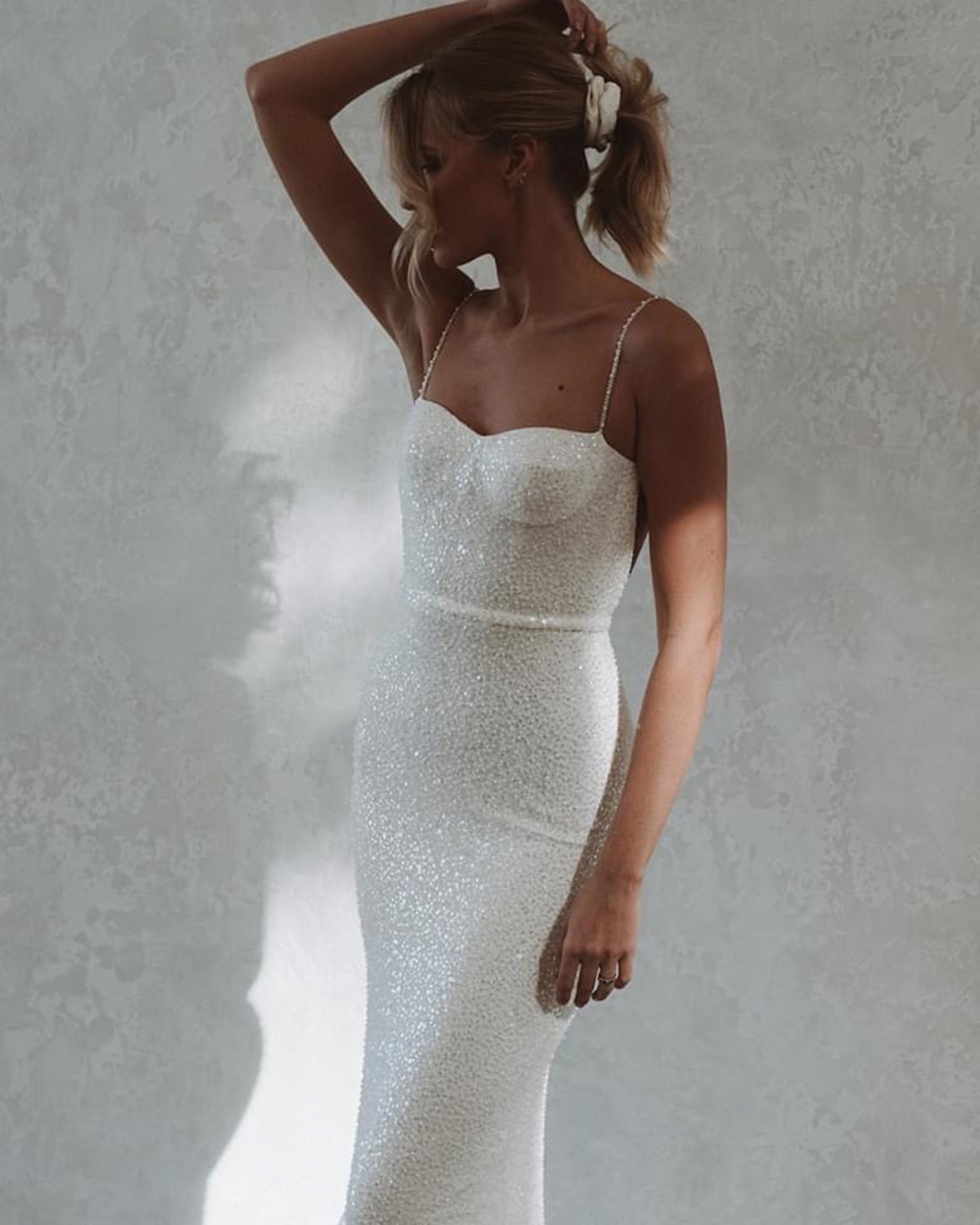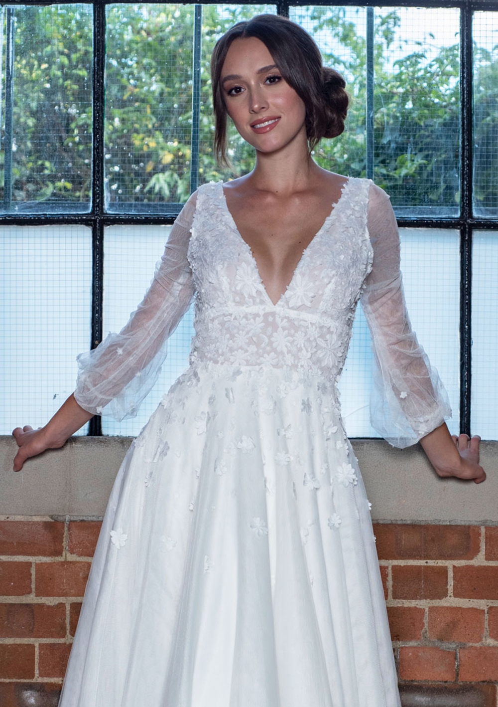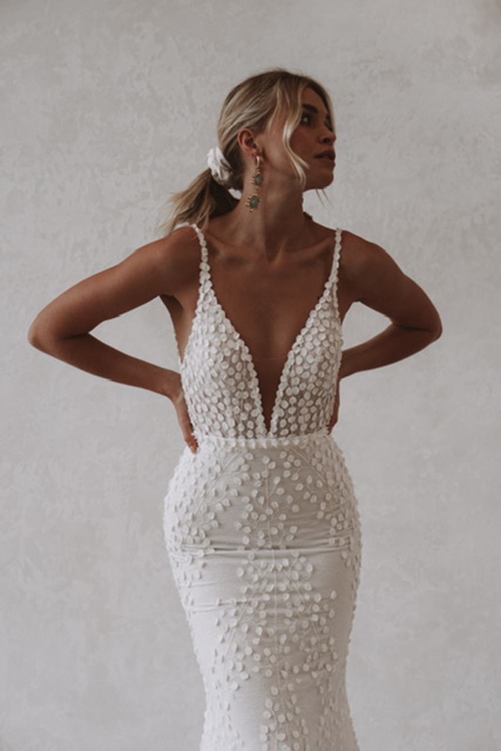 At the top of the list lies appliques and overlays decorated with floral or metallic star embroidery, giant 3D blooms and hand-stitched petals; while gowns encrusted with pearls, beads, buds, buttons and sparkle - either a few or head-to-toe - are also hot in demand.