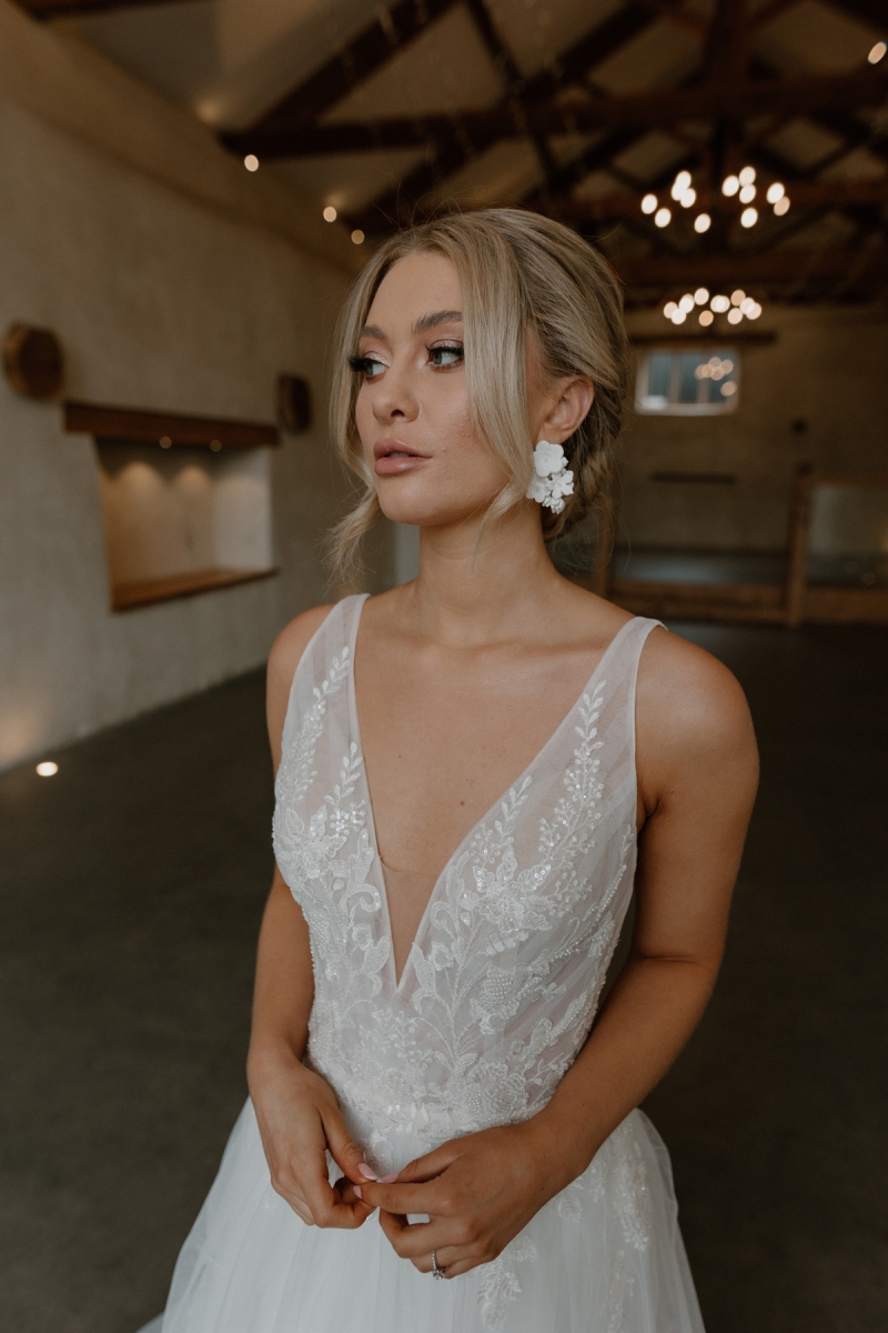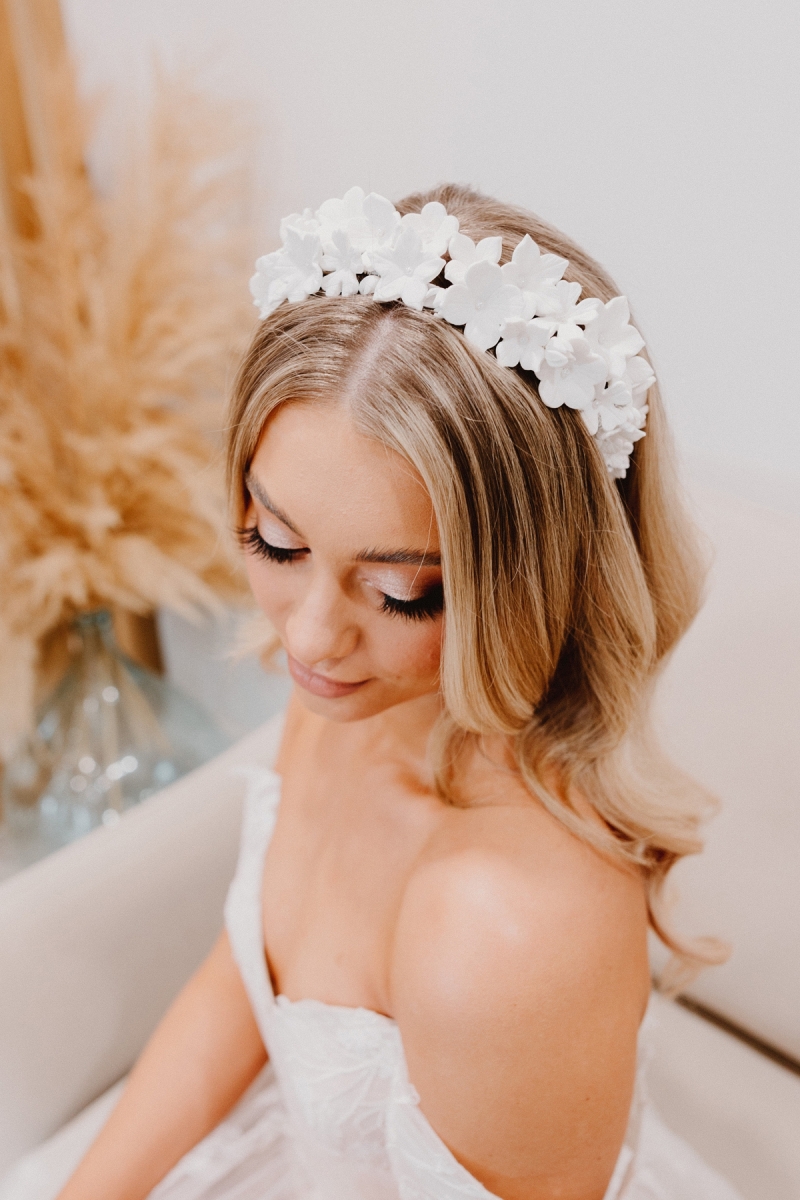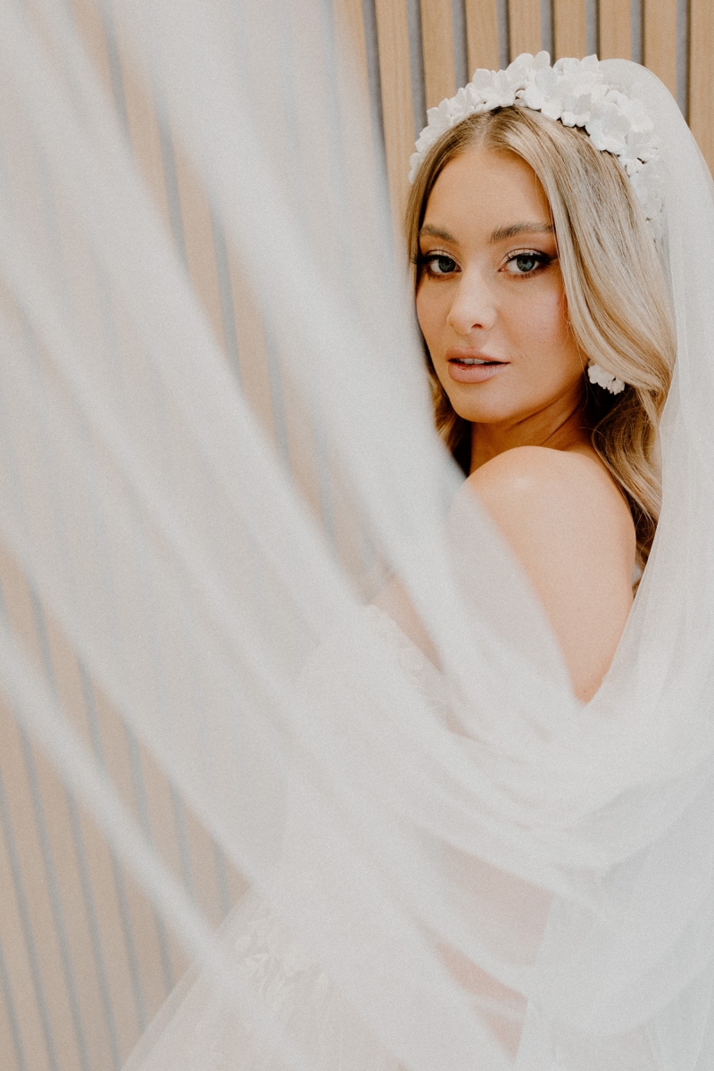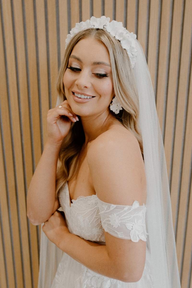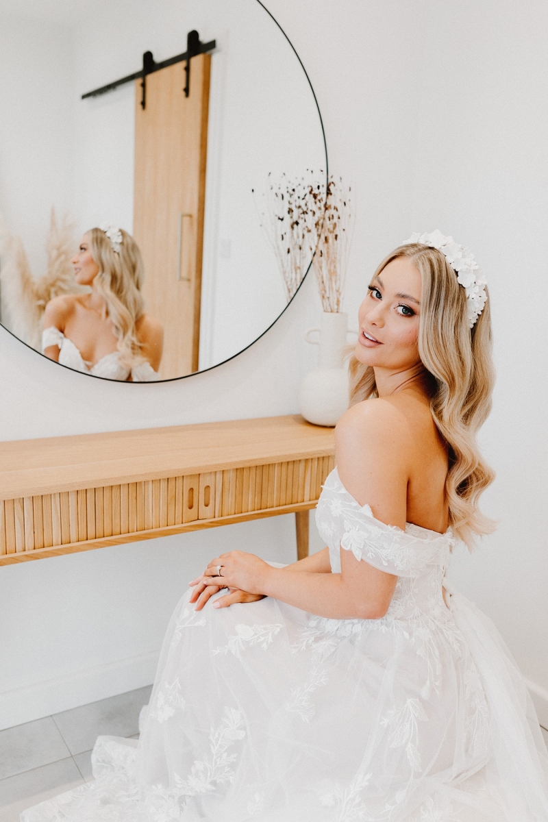 Beginning in The Paddock - a gorgeous, dedicated space for the pre-wedding preparations - and the model lavishes in the VIP treatment from the shoot's expert hair and beauty artists. A natural, yet glamorous look uses neutral make-up tones with soft shades of peach and pink to create a fresh-faced bridal beauty. The hair style moves from elegant loose waves with a boho floral headband to a low bun updo with long loose strands embellished with pearl and floral headpins, with eye-catching floral earrings to match.