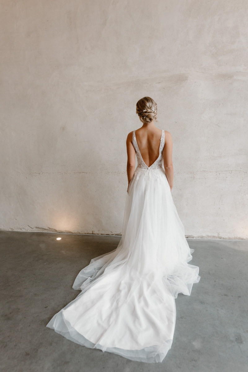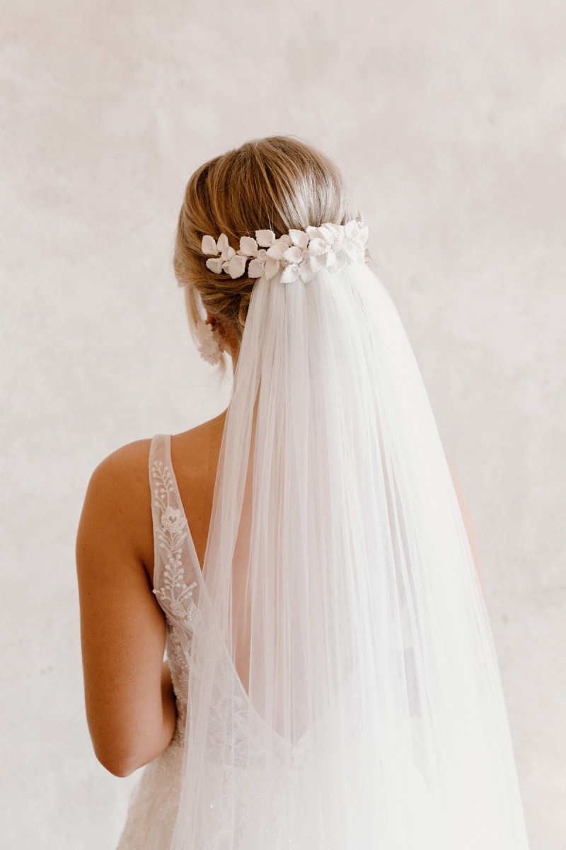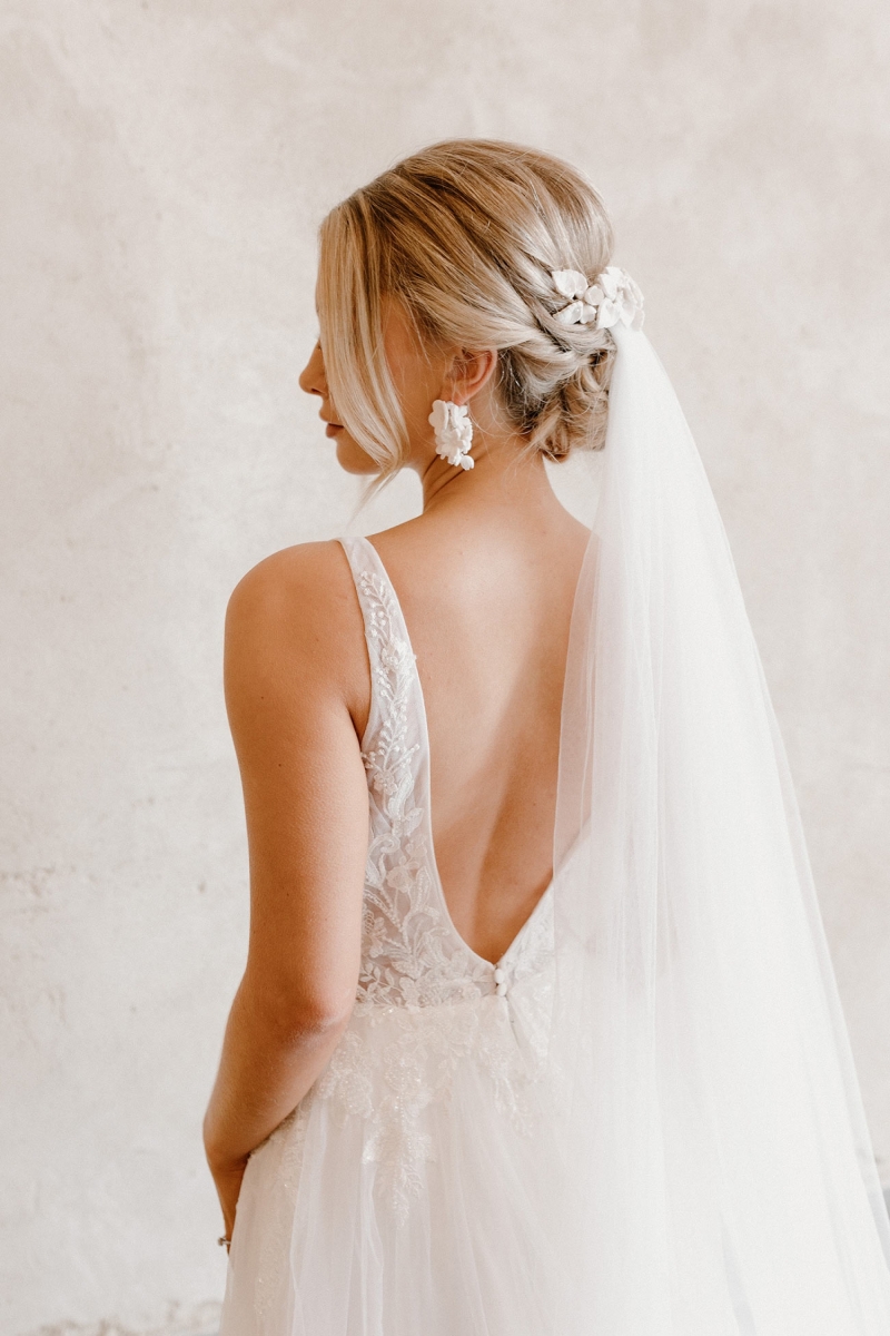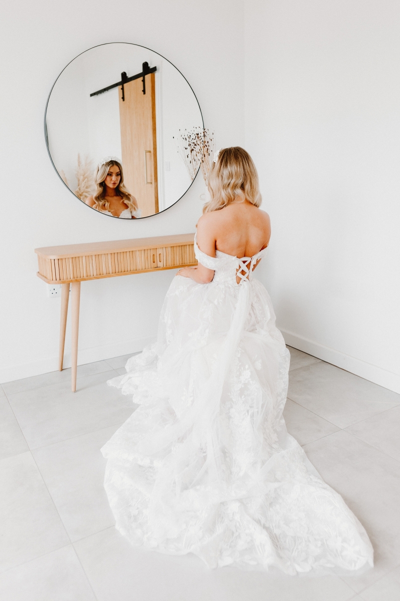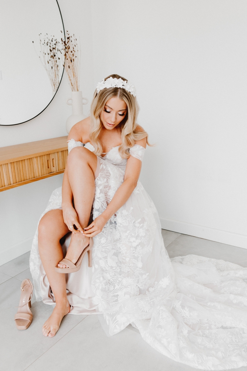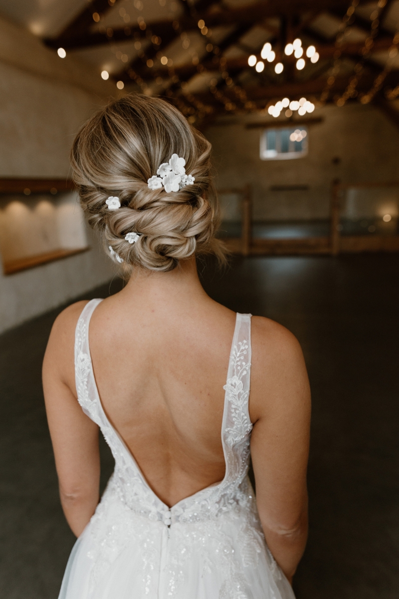 Beginning in The Paddock - a gorgeous, dedicated space for the pre-wedding preparations - and the model lavishes in the VIP treatment from the shoot's expert hair and beauty artists. A natural, yet glamorous look uses neutral make-up tones with soft shades of peach and pink to create a fresh-faced bridal beauty. The hair style moves from elegant loose waves with a boho floral headband to a low bun updo with long loose strands embellished with pearl and floral headpins, with eye-catching floral earrings to match.