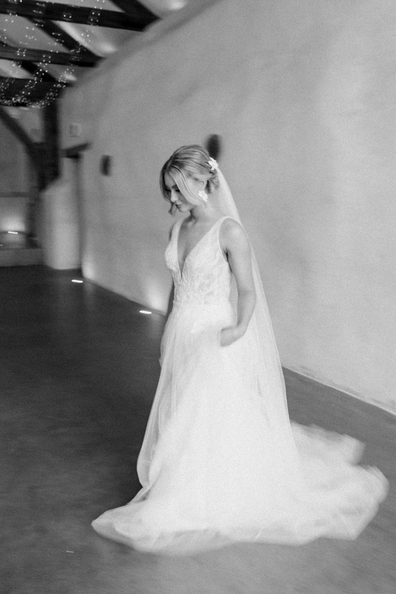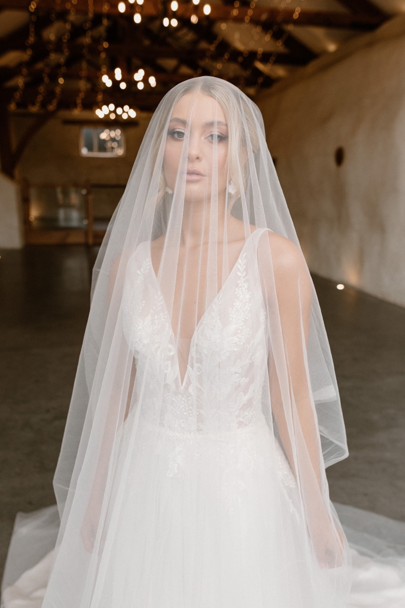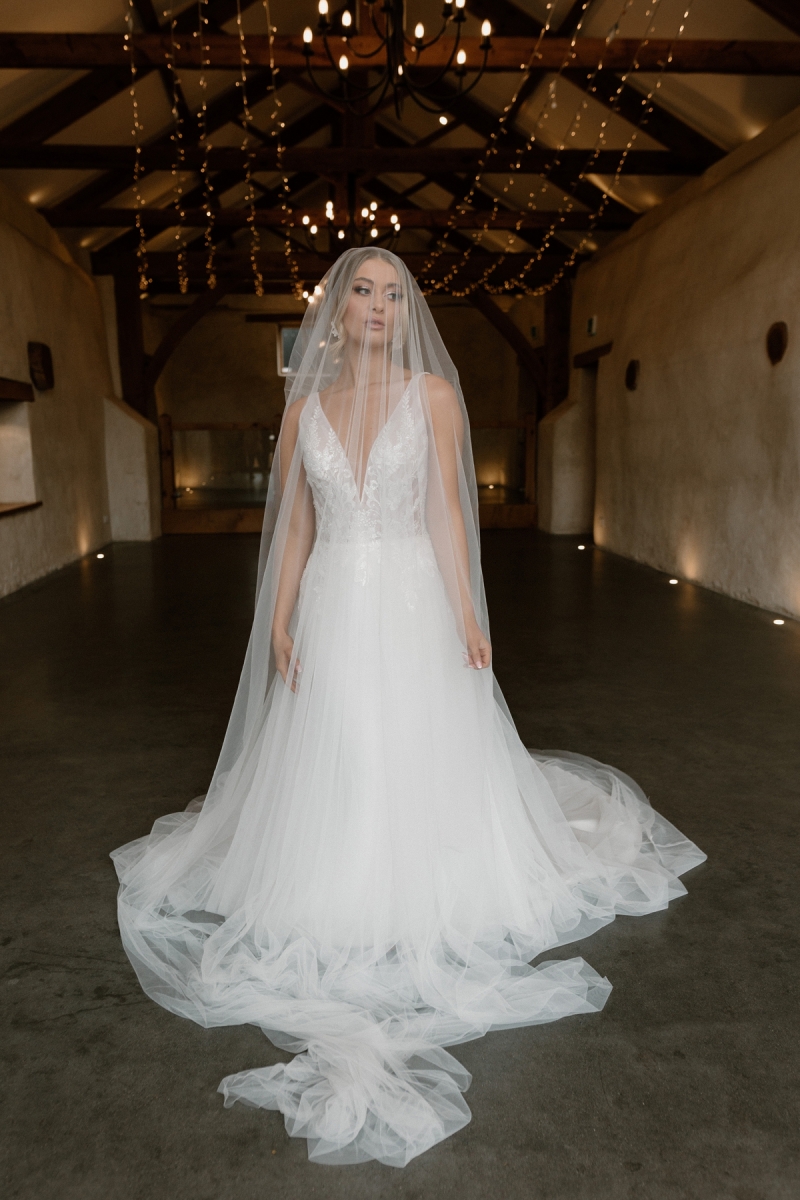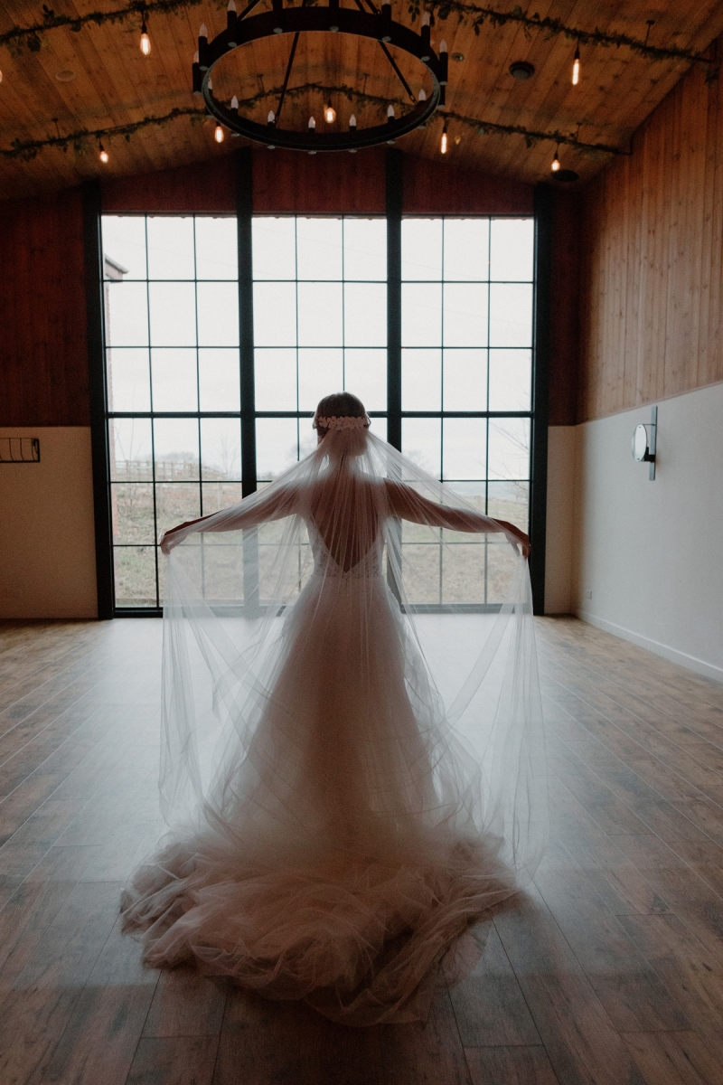 A sweeping, floor-length veil lends a dose of high drama alongside the overhead chandeliers as the bride swishes and sways across the barn floor in a vision of modern romance.