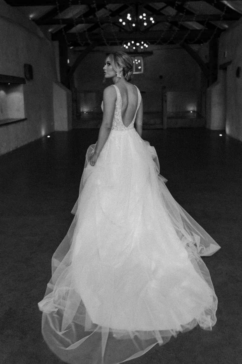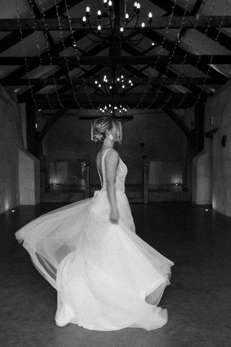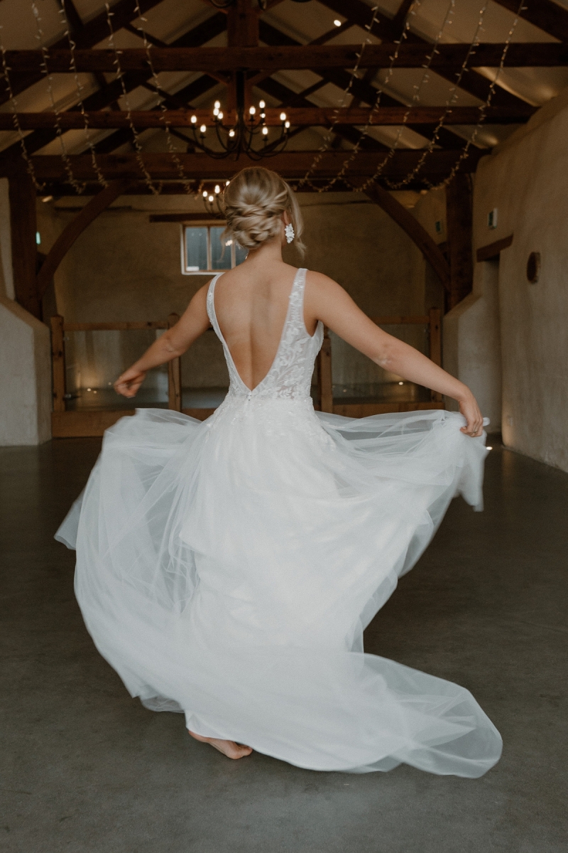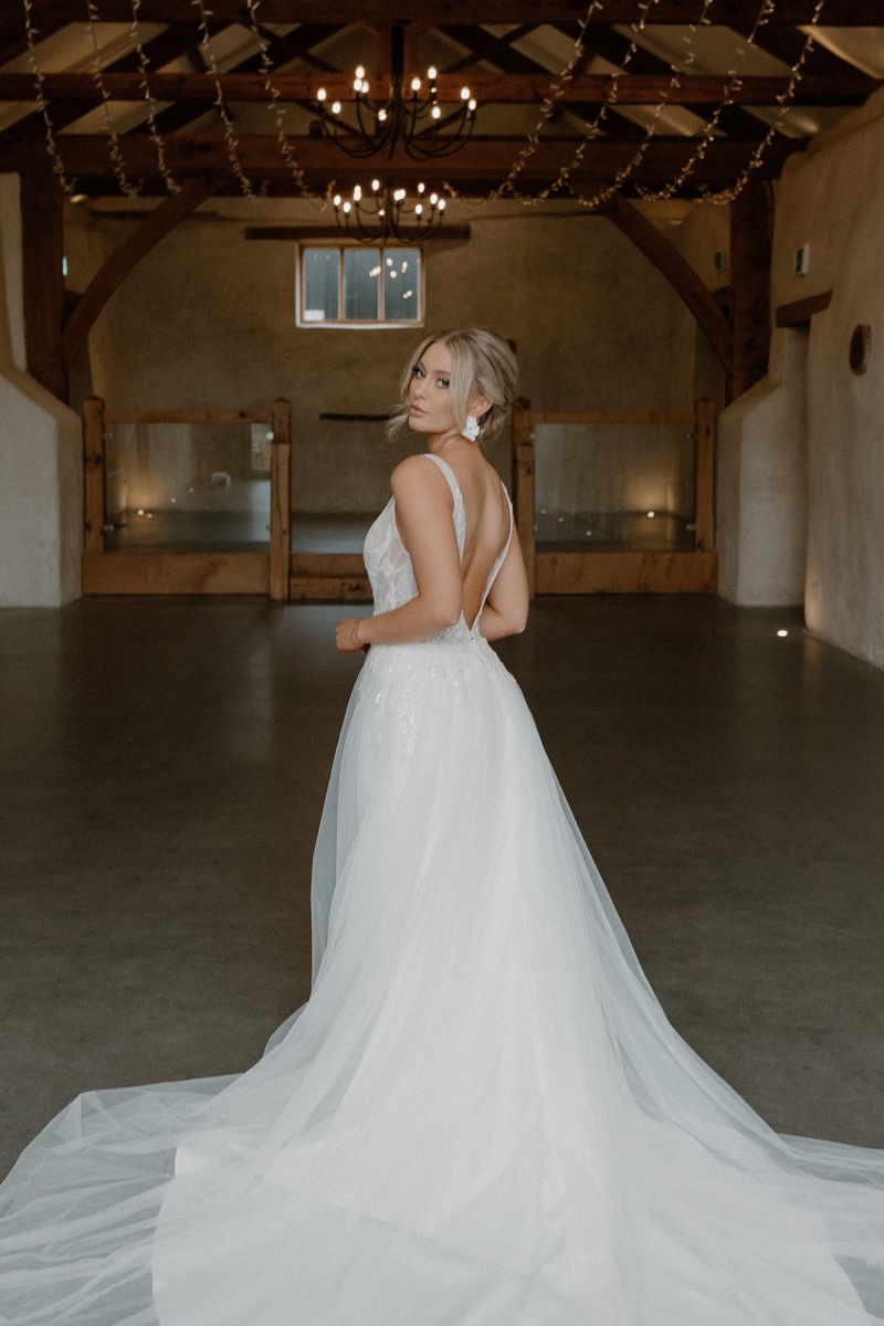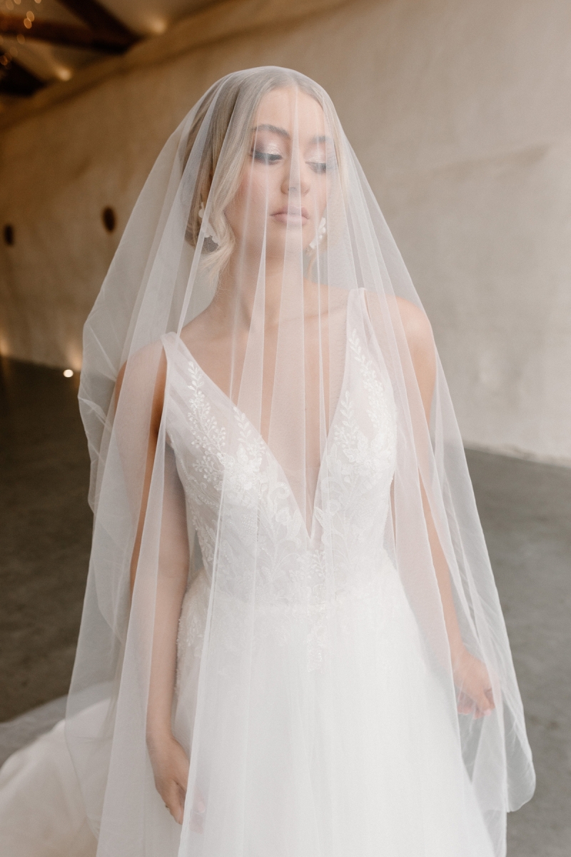 A sweeping, floor-length veil lends a dose of high drama alongside the overhead chandeliers as the bride swishes and sways across the barn floor in a vision of modern romance.