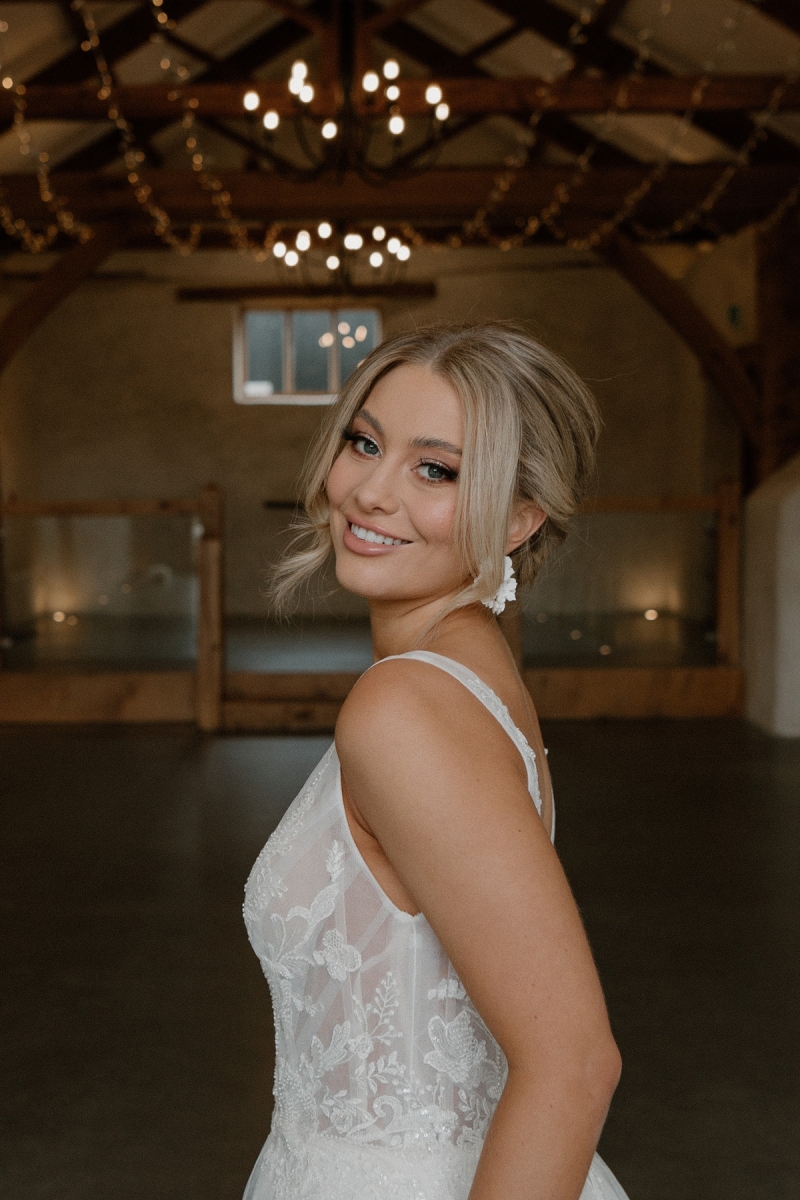 Take a stunning dress styled to utter perfection and shoot it in beautiful barn for a beauty editorial replete with modern romance. Here, the simple yet striking venue allows the bridal style to fully stand out while framing it with fairy lights and floor-to-ceiling windows that hint at the rural landscapes beyond. The result? A dazzling bride and a glimpse into the magic of an Upton Barn & Walled Garden wedding.