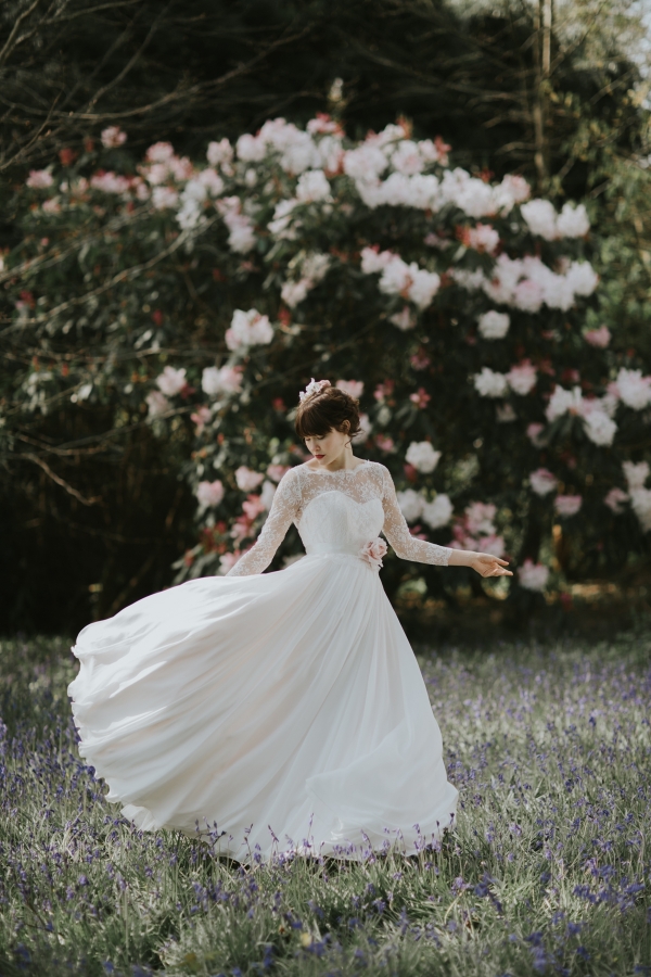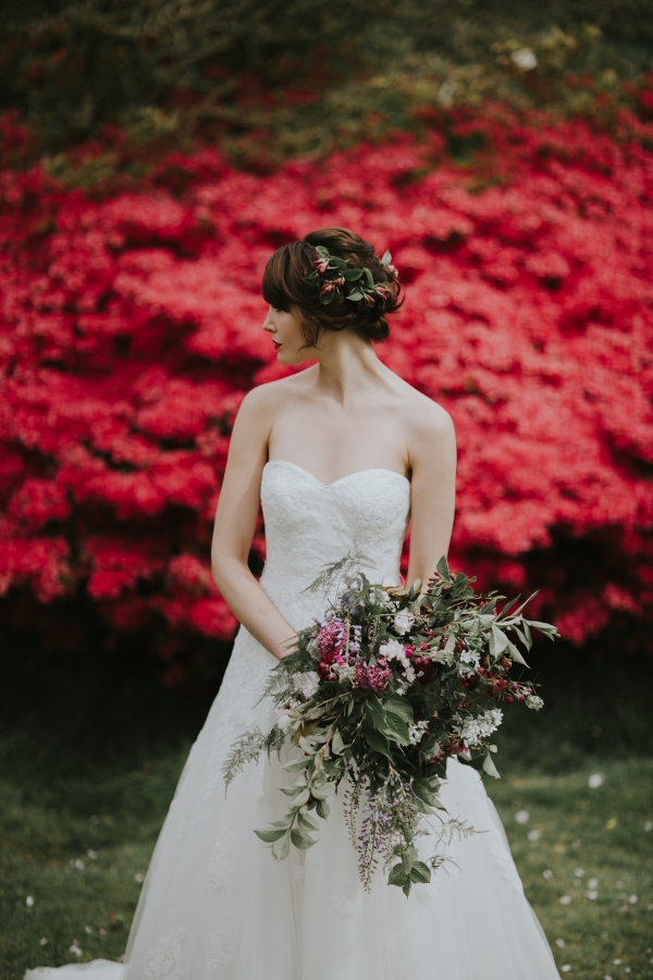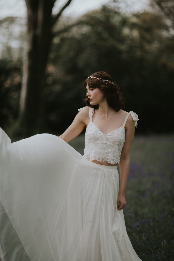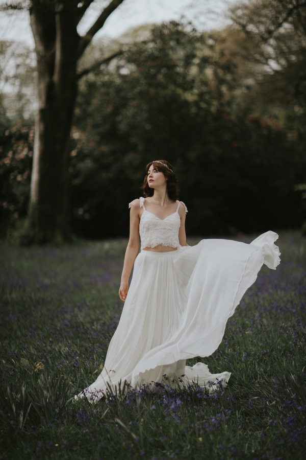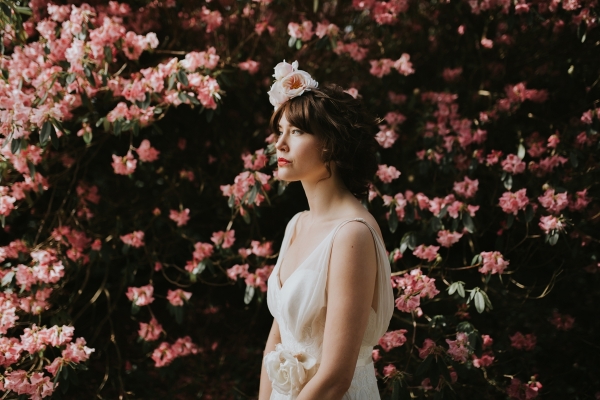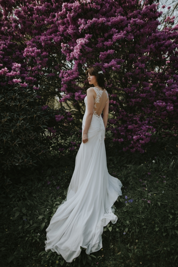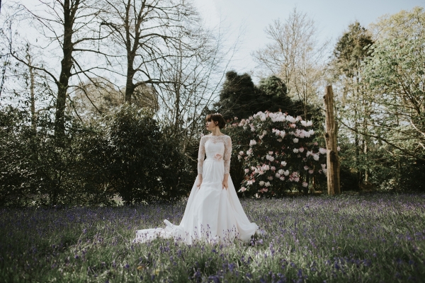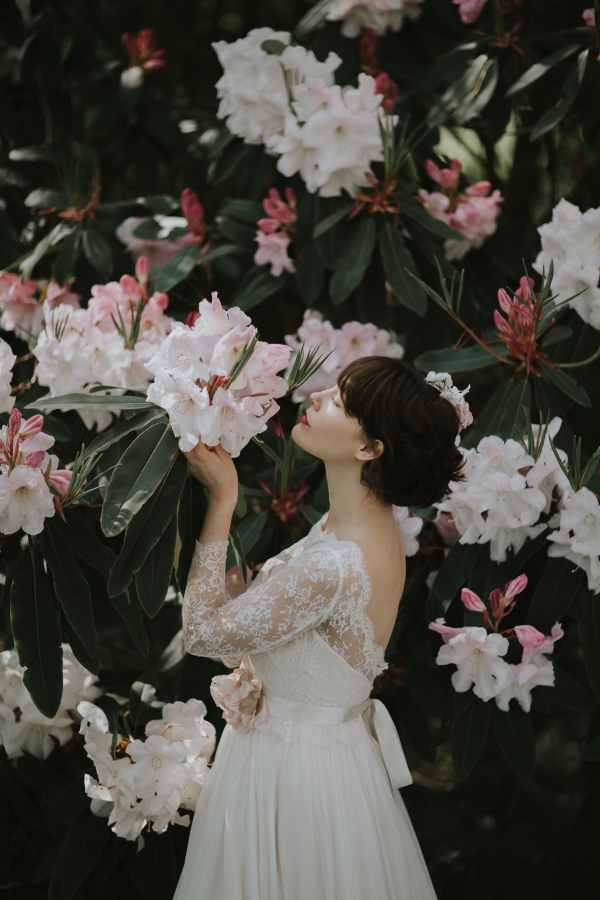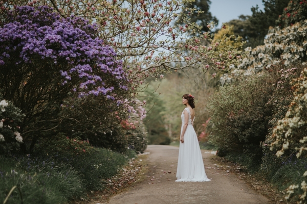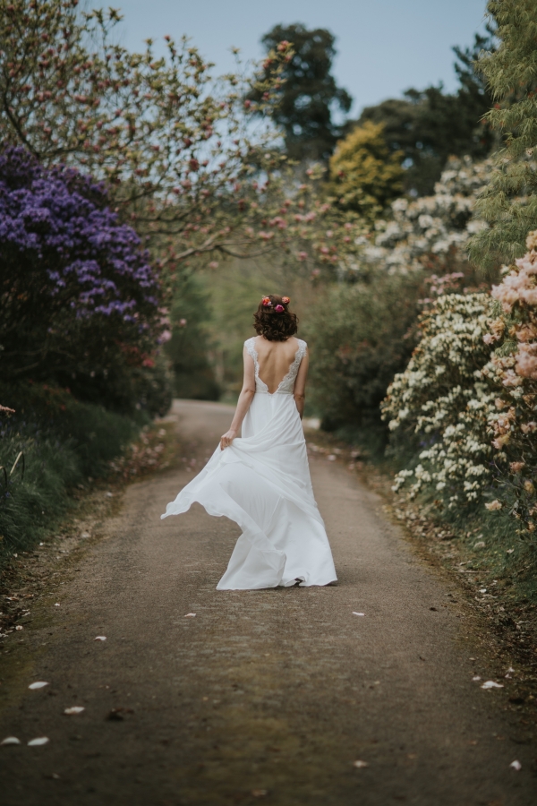 The gardens of Burncoose House make a glorious backdrop for romantic gowns embellished with whimsical florals