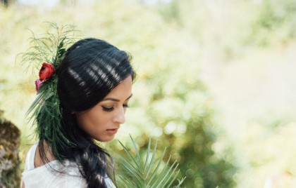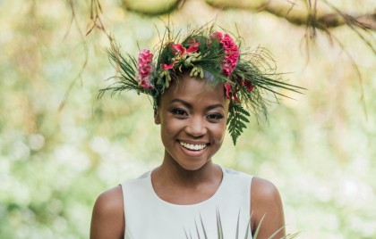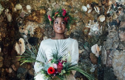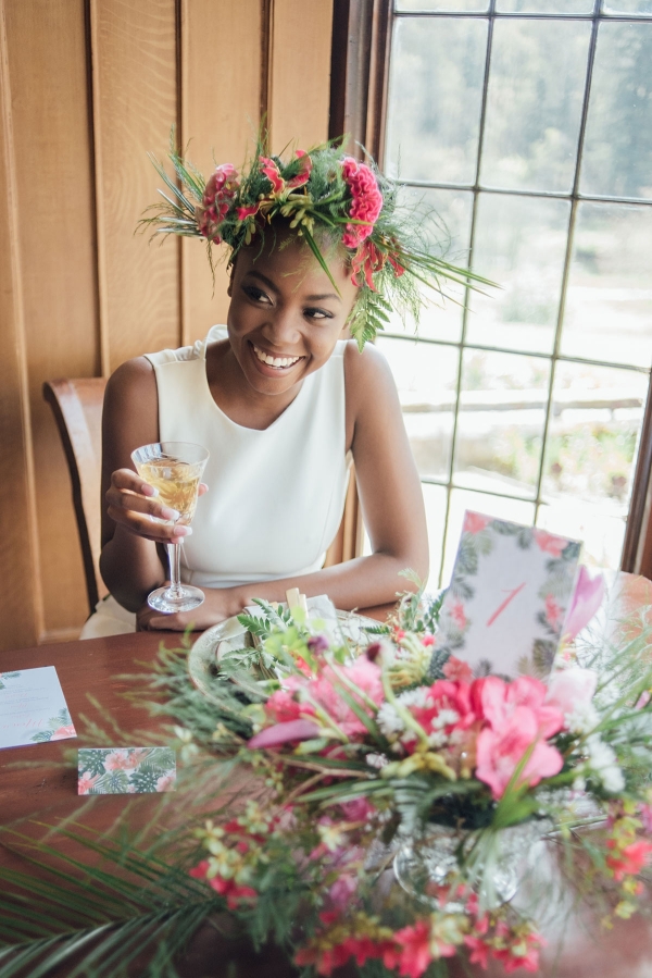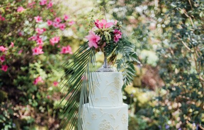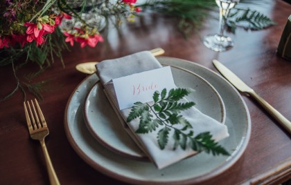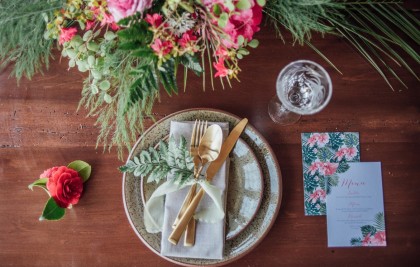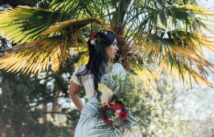Taking an elegant twist on tropical wedding styling, it was the perfect setting to capture this stunning shoot. "My inspiration came from my love of nature and passion for anything floral," explains photographer and stylist Amber Leach of Liberty Pearl Photography. "Taking a tropical, elegant and chic aesthetic with a huge emphasis on tropical florals and greens, the models wore couture wedding dresses, locally handmade jewellery and beautiful floral designs in their hair." As well as an abundance of foliage and vibrant blooms, handcrafted details from local talents were a key element of the look: pottery from the renowned Leach Pottery, glassware from Dartington Crystal, cutlery from The Cutlery Commission and exquisite jewellery from Plymouth gallery, Victoria Sewart, all added a beautifully handmade and individual touch to this captivating scheme.