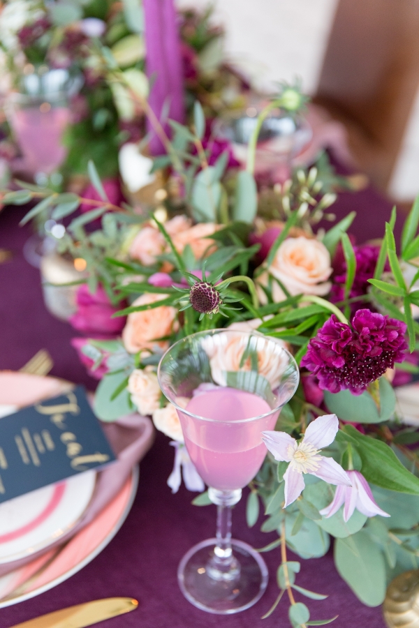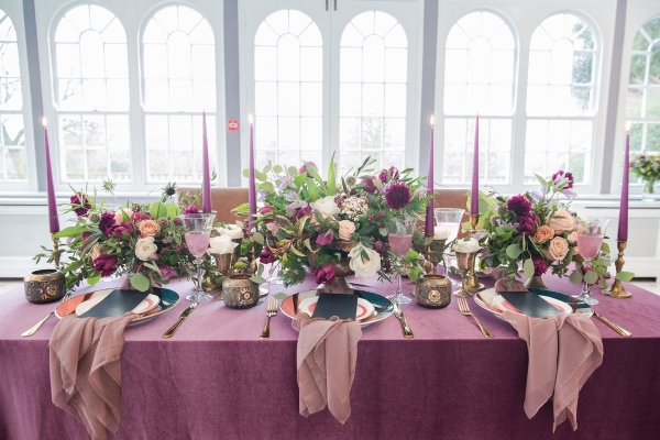 "We created a stunning tablescape with a bed of velvet coupled with deep tones in the florals and soft, draped napkins in delicate pink," explains Helen. "The mix of textures and tones feels so luxurious and decadent."
