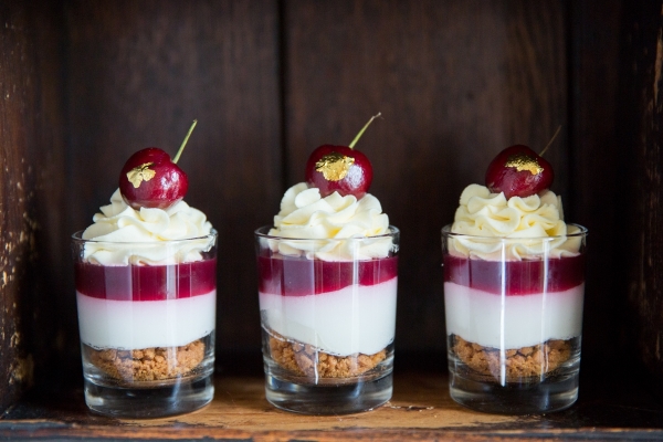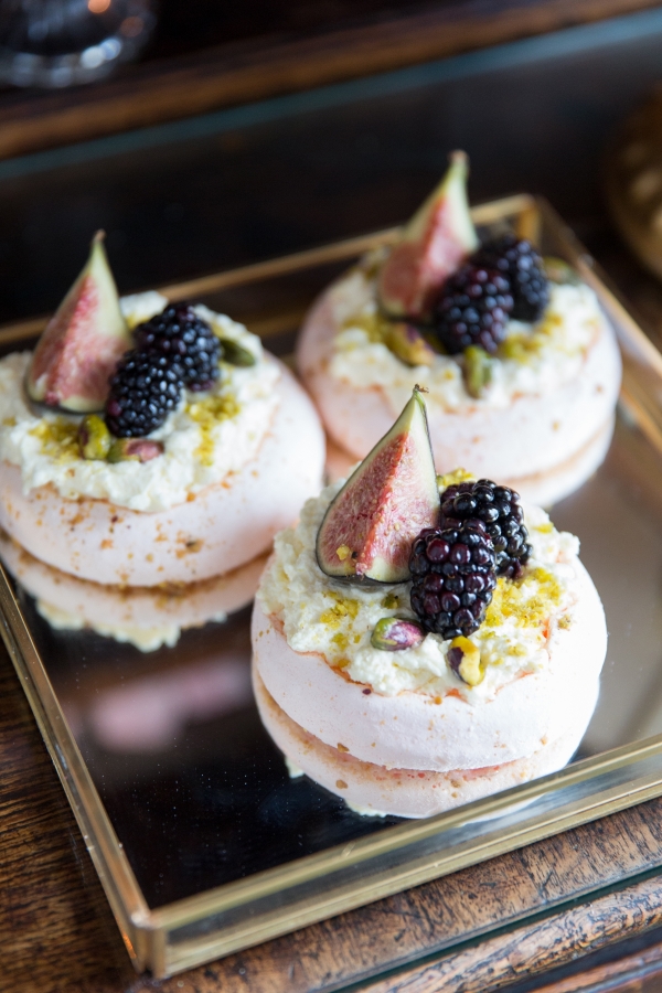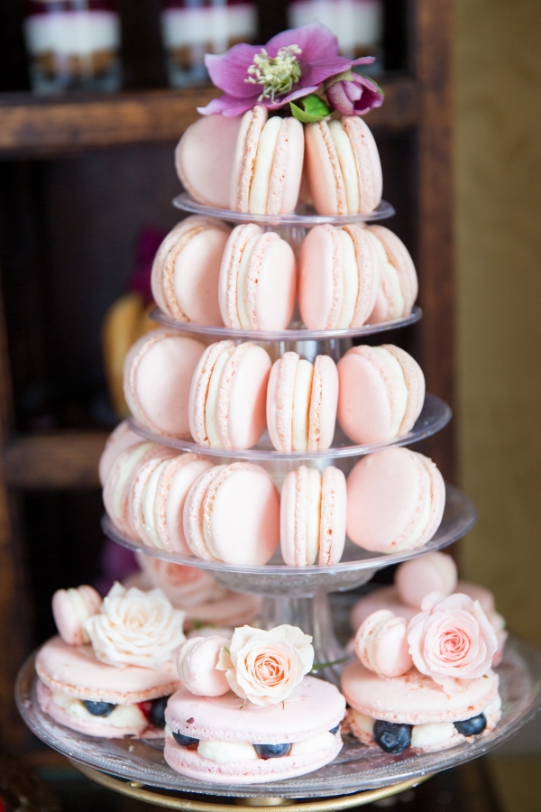 The backdrop of Bridwell, a grand country house owned by the Mountbatten family, allows the details of the shoot to shine. The food looks almost too good to eat: pastel-pink macarons are elegantly displayed as a cake-style tower, and finished with fresh flowers and blueberries. The ornate tiered cake takes pride of place on a vintage dresser, while juicy cherries edged with gold leaf, fresh figs and blackberries bring a sumptuous quality to the sugar-dusted desserts.