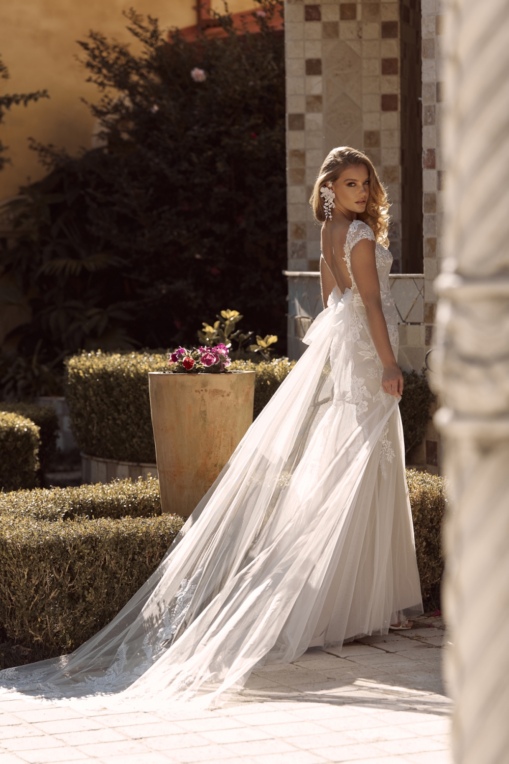 One of the best ways to modernise or personalise an outfit is to add a little extra something, and dimensional and detachable features are just the ticket. Think tulle overskirts, giant corsages, billowing or puff off-the-shoulder sleeves, and veils and trains dotted with 3D flowers.