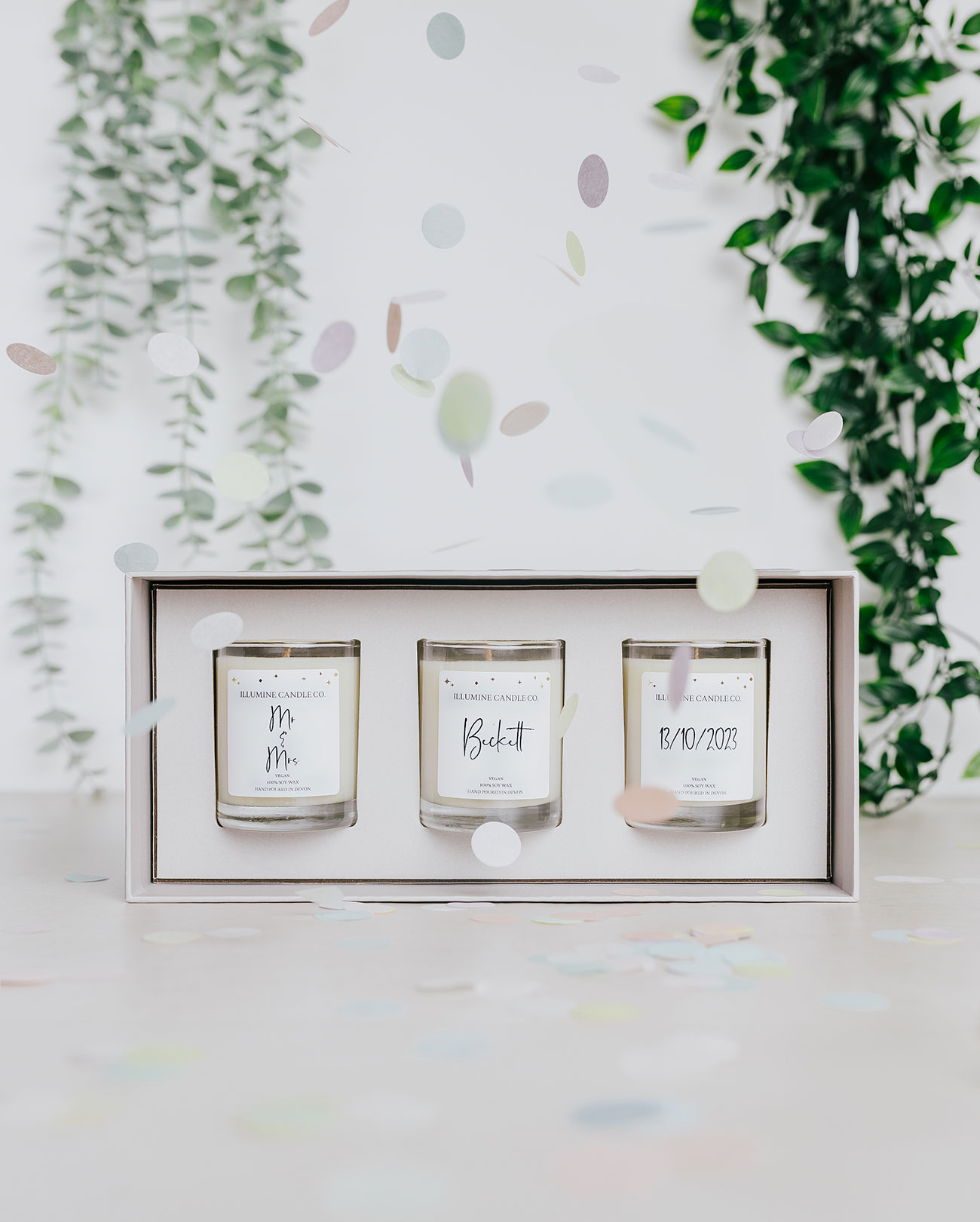 Give your wedding a signature scent by lighting candles from Exeter-based Illumine Candle Co. throughout your venue. The 100% soy wax candles come in a delicious range of scents from jasmine and magnolia to caramelised biscuit. Gift your guests a candle of their own in the same fragrance - or a wedding day gift set - as a thank you token.