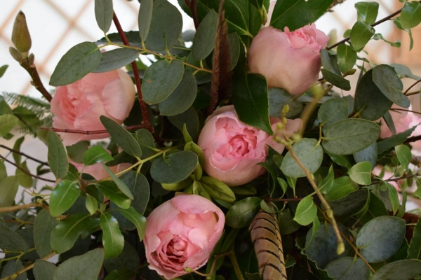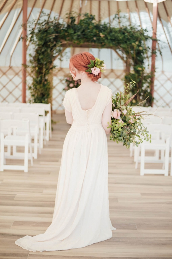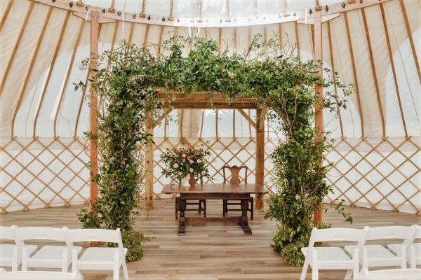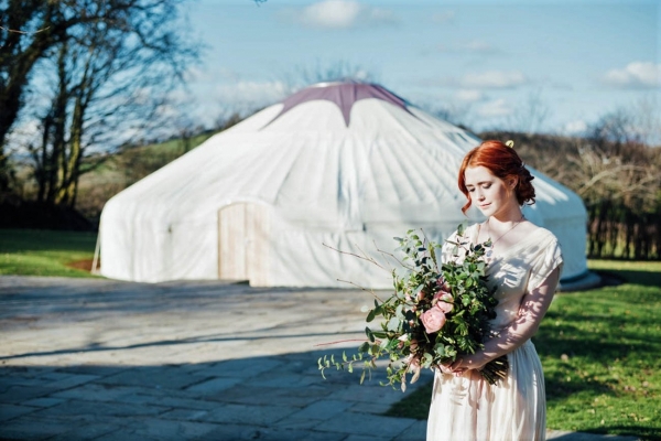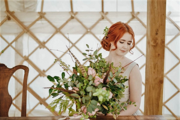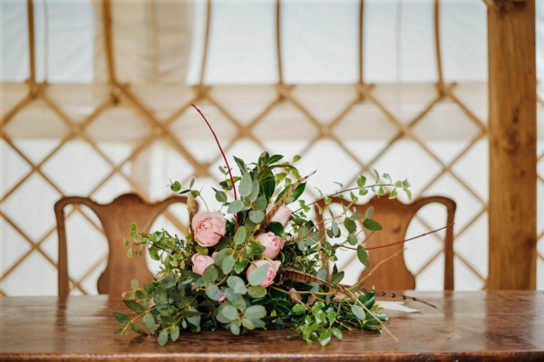 A beautifully crafted yurt, made from locally sourced Devon ash, provides a light and airy space to showcase the florals, with giant urns being used to dramatic effect. Introducing soft colour and focal interest to the bridal bouquet, blousy garden roses bring a fragrant blush to the posy, finished with trailing hand-dyed long silks.