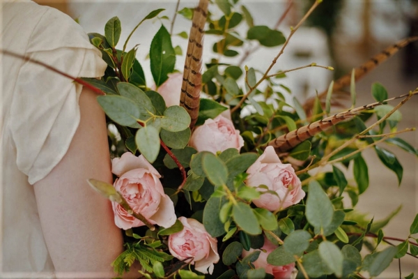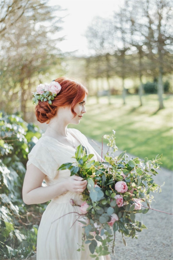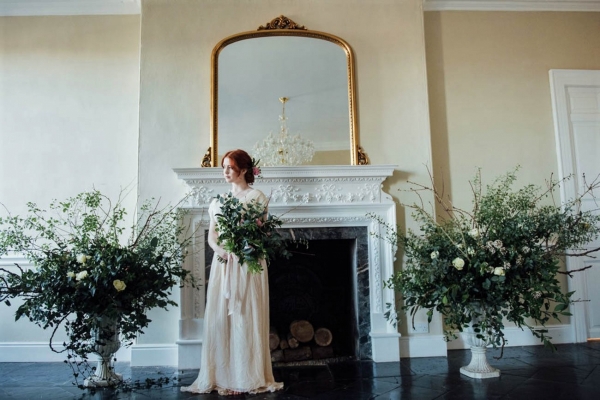 Seasonal and locally grown foliage and armfuls of branches brings a loosely styled and heavily natural element, tempered by the poise of the bride and the elegance of her gown. Soft and flowing, the layers of textures and fabric match the flowing foliage designs, enhanced by subtle and barely there make-up and a hairstyle twisted with curls and tendrils.