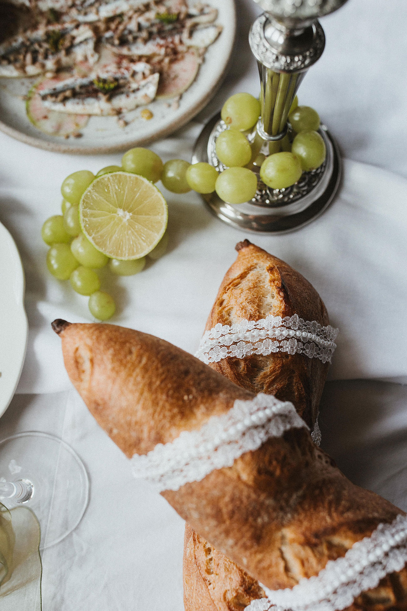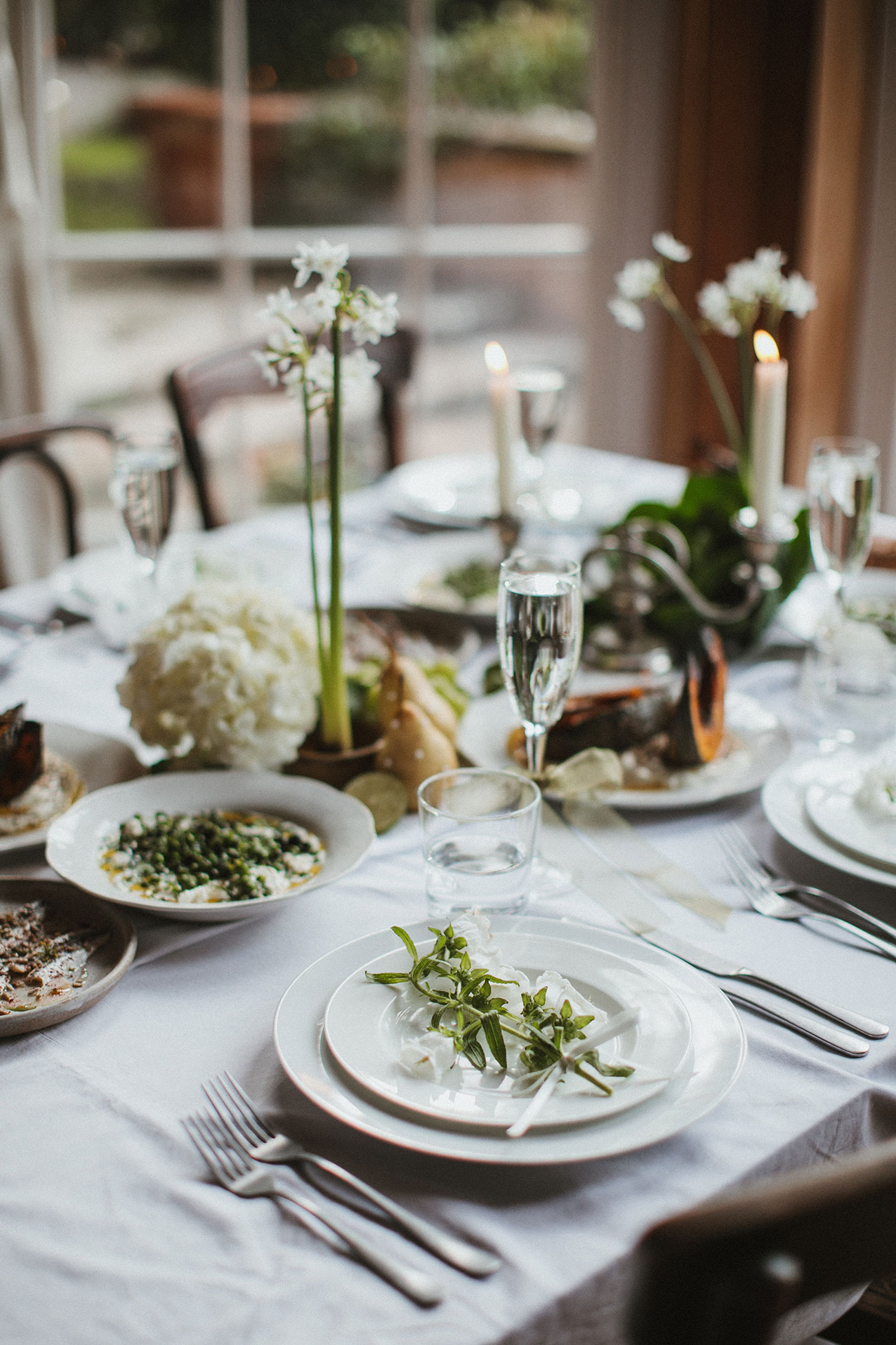 Set within the grandeur of The Lost Music Hall, a luxury country manor house venue in South Devon, a vibrant tablescape celebrates the bounty of the South-west, with beautifully styled food and flora piquing all the senses. “Here in the South-west, we are so lucky to be within arm’s reach of so many incredible farmers and local producers,” explains Ayse. “We wanted to celebrate this with a tablescape that celebrates both the food and the flora in one: big green rosettes of Brussel tops and pearled golden pears with the season’s most delicate narcissus.”