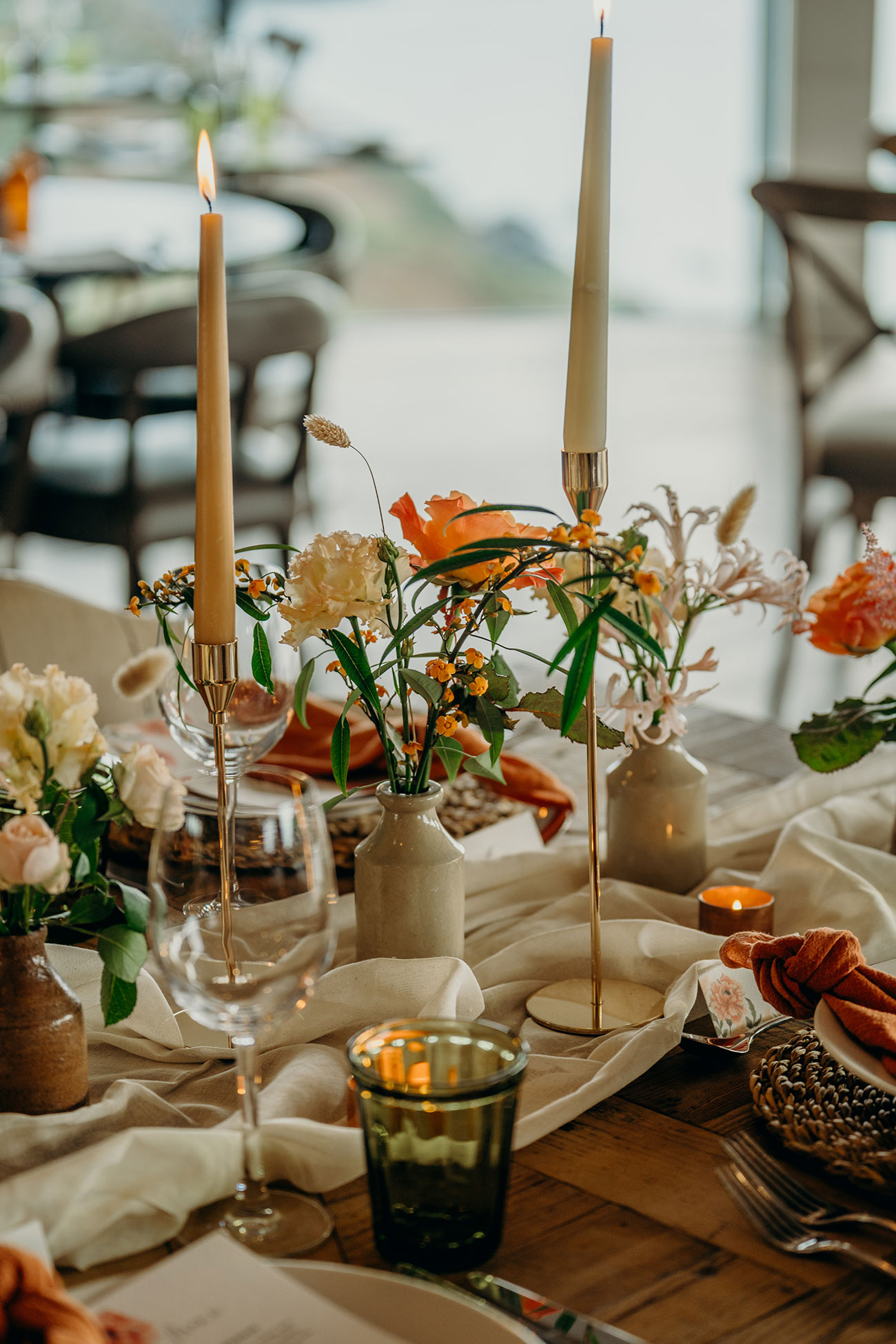 The tablescape is richin earthy tones and natural textures: blooms with a just-gathered feel nestle green glassware, rattan charger plates, tapered candles and stationery dotted with warm orange florals. Adorned with textured dried blooms, the ceremony arch frames the seascape, making a spectacular setting to exchange vows.