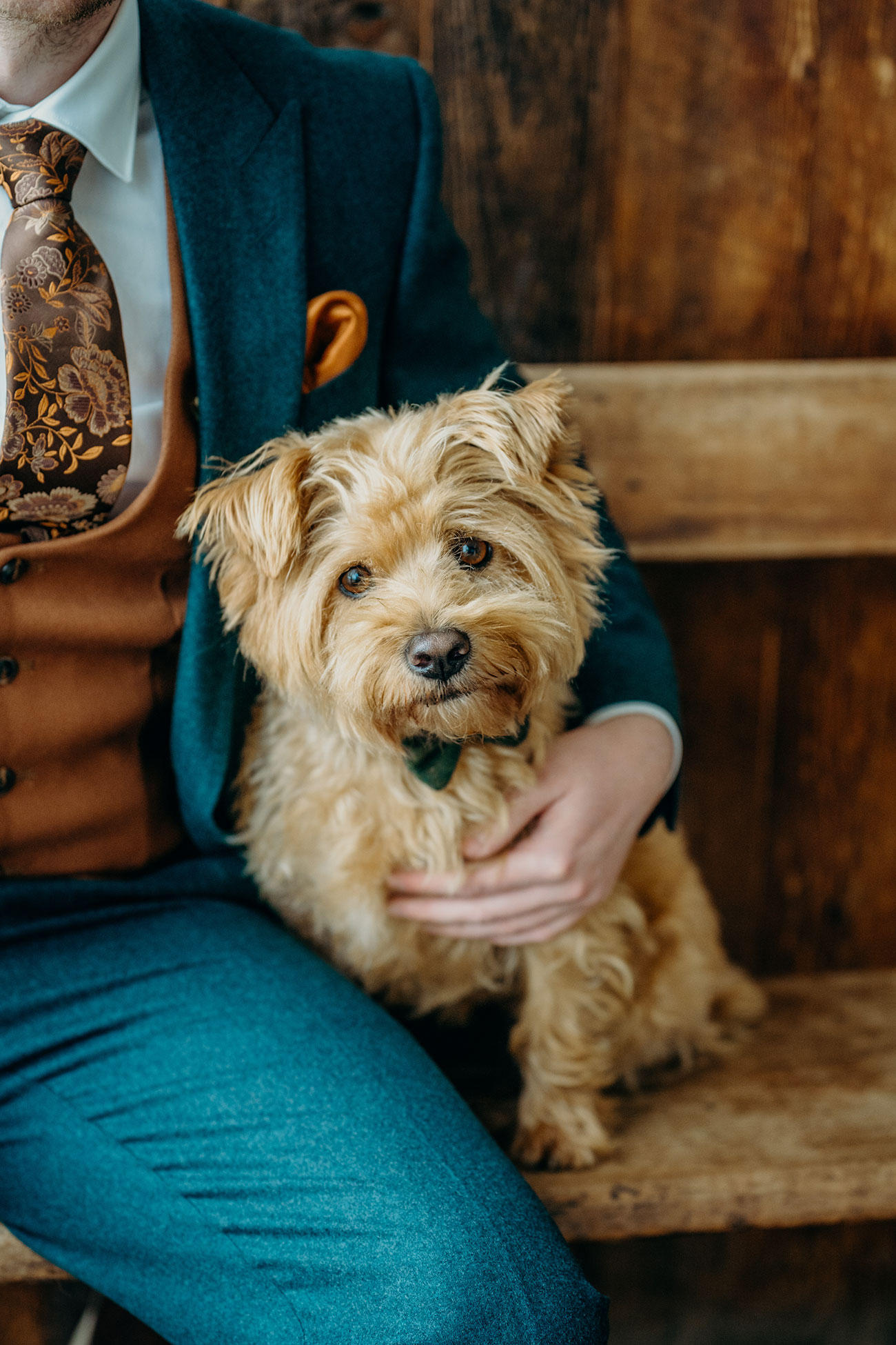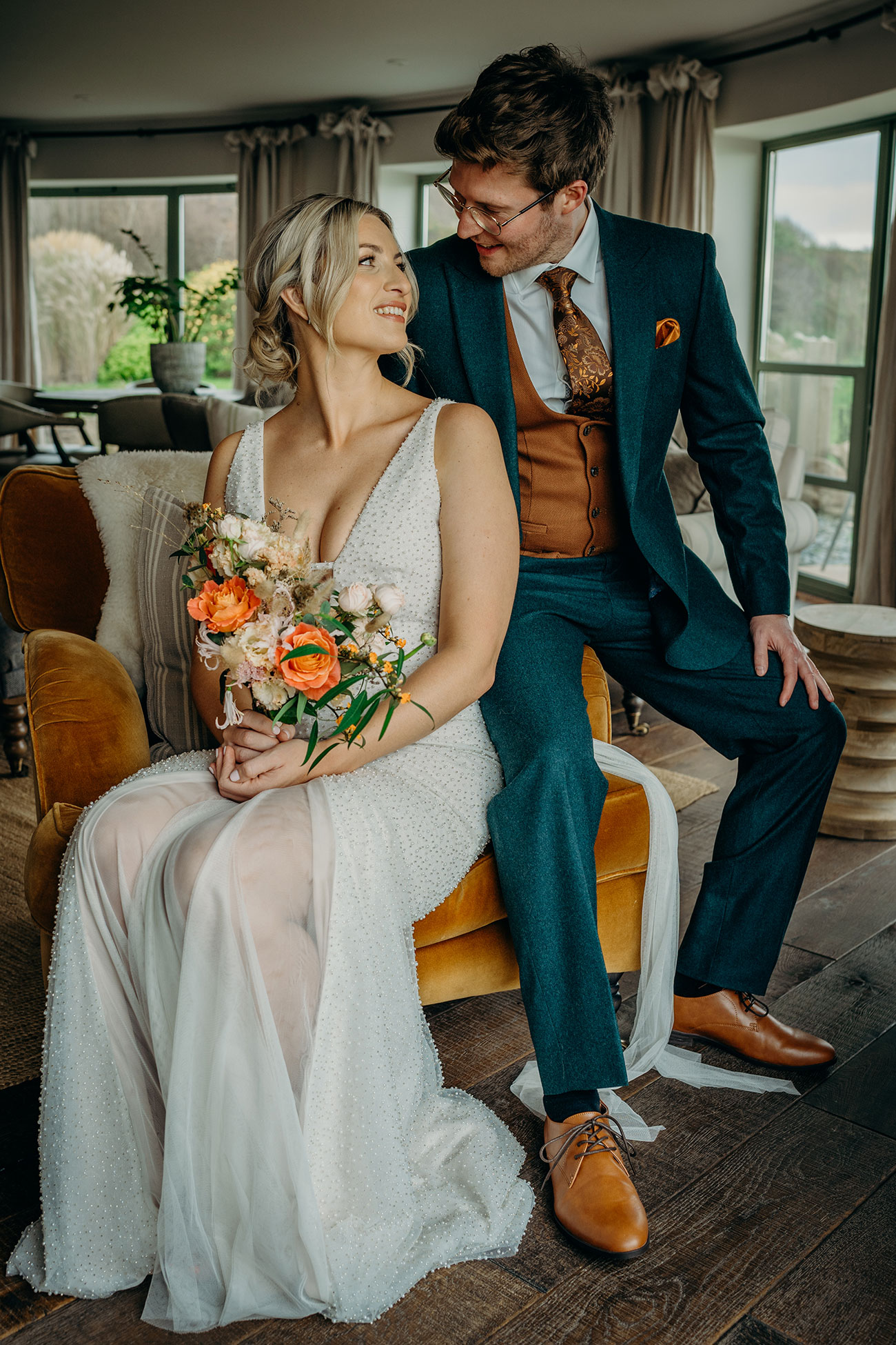 Fittingly, the models - real couple Aoife and James - have a love story of their own playing out in this extraordinary setting. “Aoife and James were engaged at Gara, and they're returning in 2024 to tie the knot,” says Simone. James's attire blends seamlessly with the rich blue and ochre shades of the aesthetic, while Aoife's bridal gowns - teamed with natural make-up and a soft updo, balance contemporary style with relaxed romance - perfect for loved-up wanders on the clifftops.