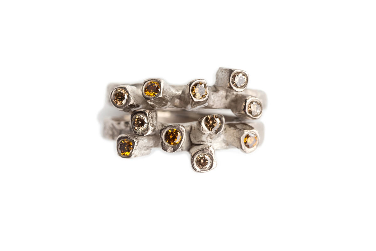 You might choose a ring with texture for an alluringly organic and less formal style - as beautifully achieved by Emily Nixon's sculptural designs; in particular, her stunning urchin rings with rub over settings, and rough diamond pieces. Or opt for a fabulous golden coloured diamond such as that pictured in a warm cinnamon brown.