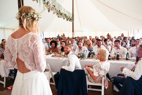 As it's still a fairly novel idea for a bride to speak at her own wedding, there isn't exactly a template to follow. The main thing to bear in mind is ensuring you don't just rehash what has already been said. We suggest you chat it through with your partner and decide who will be responsible for what. Or if that sounds too much like ruining the magic, have a trusted friend listen to both and highlight any duplicates.