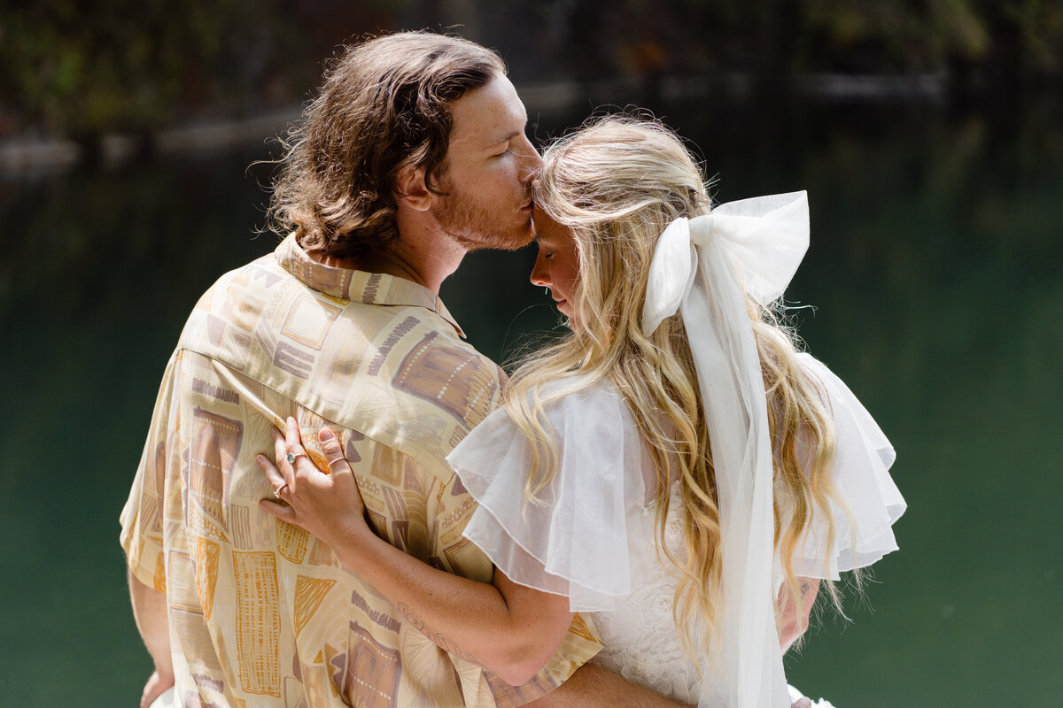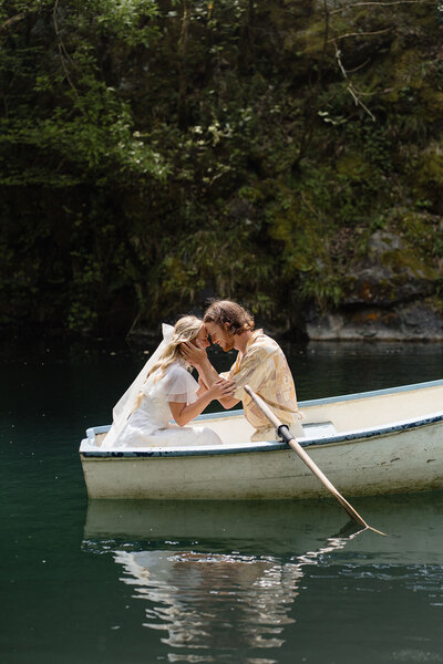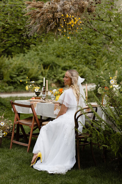 Rowing across the still waters of the lake with her beau, the bride dons an airy chiffon dress, an embroidered bow and statement earrings. Complete with flowing locks and bright yellow heels, it is an ethereal yet playful look - perfect for a close-to-nature – and earth-friendly summer wedding.