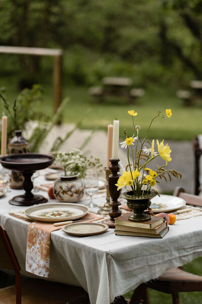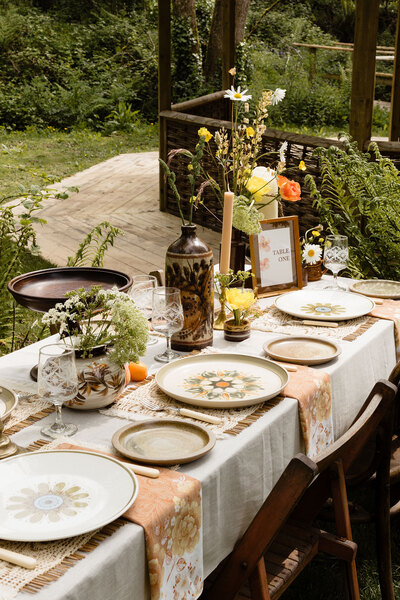 Evoking a summer mood with its gorgeous palette of warm neutrals spliced with shades of sunshine yellow, tangerine and lush green, the al fresco tablescape is styled with natural textures, just-picked florals and retro accents for a scene rich in eclectic character.