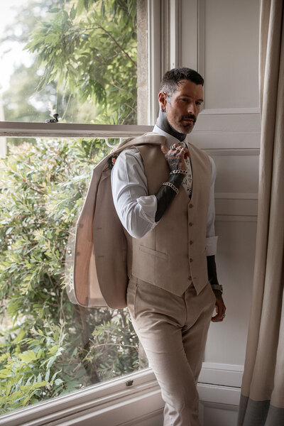 The groom, not to be outdone, wears two equally dashing ensembles. First, an on-trend sand-toned outfit elevated with a floral tie and pocket square, finished with two-tone brogues. Later, he dons a dapper three-piece slate-grey suit with a polka-dot tie, brown leather loafers and a wildflower buttonhole – the epitome of modern rustic style.
