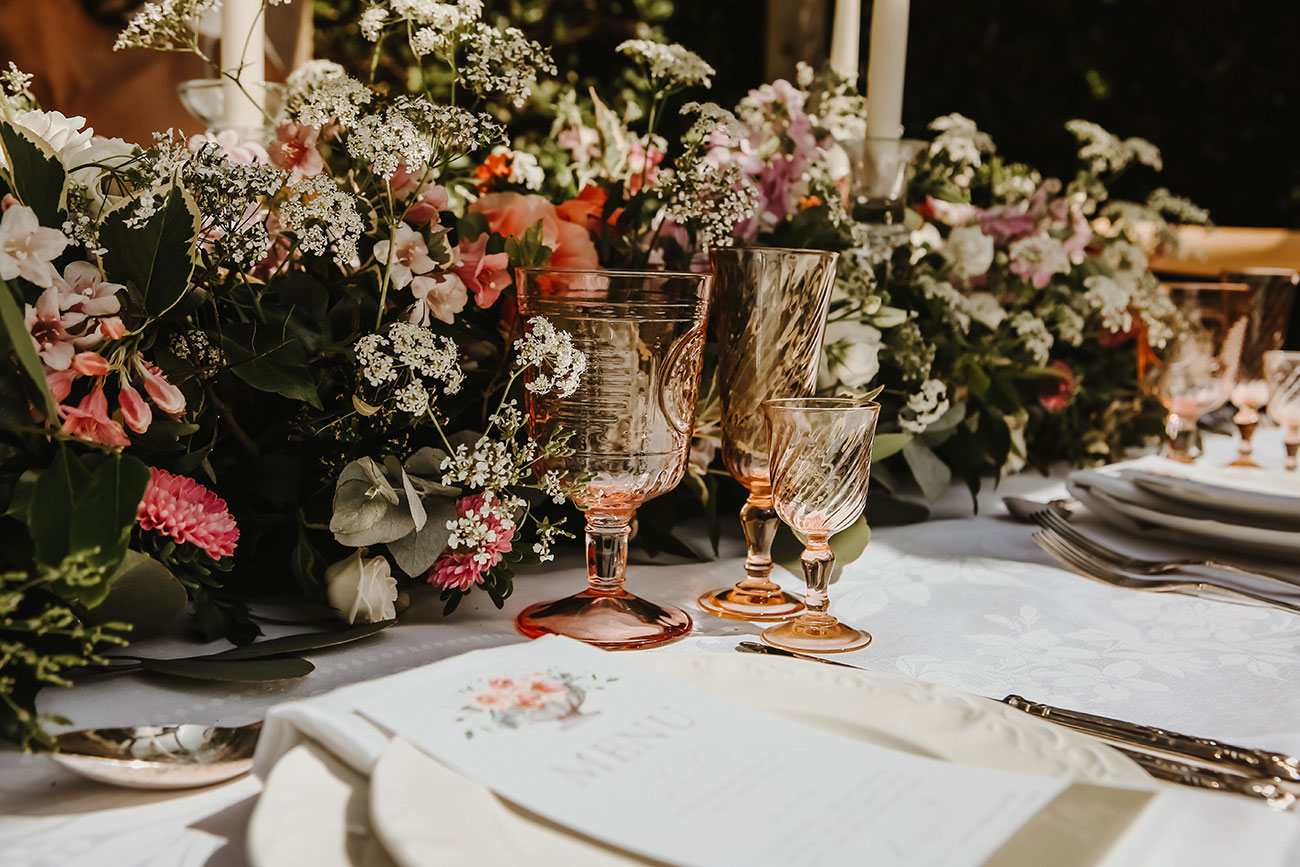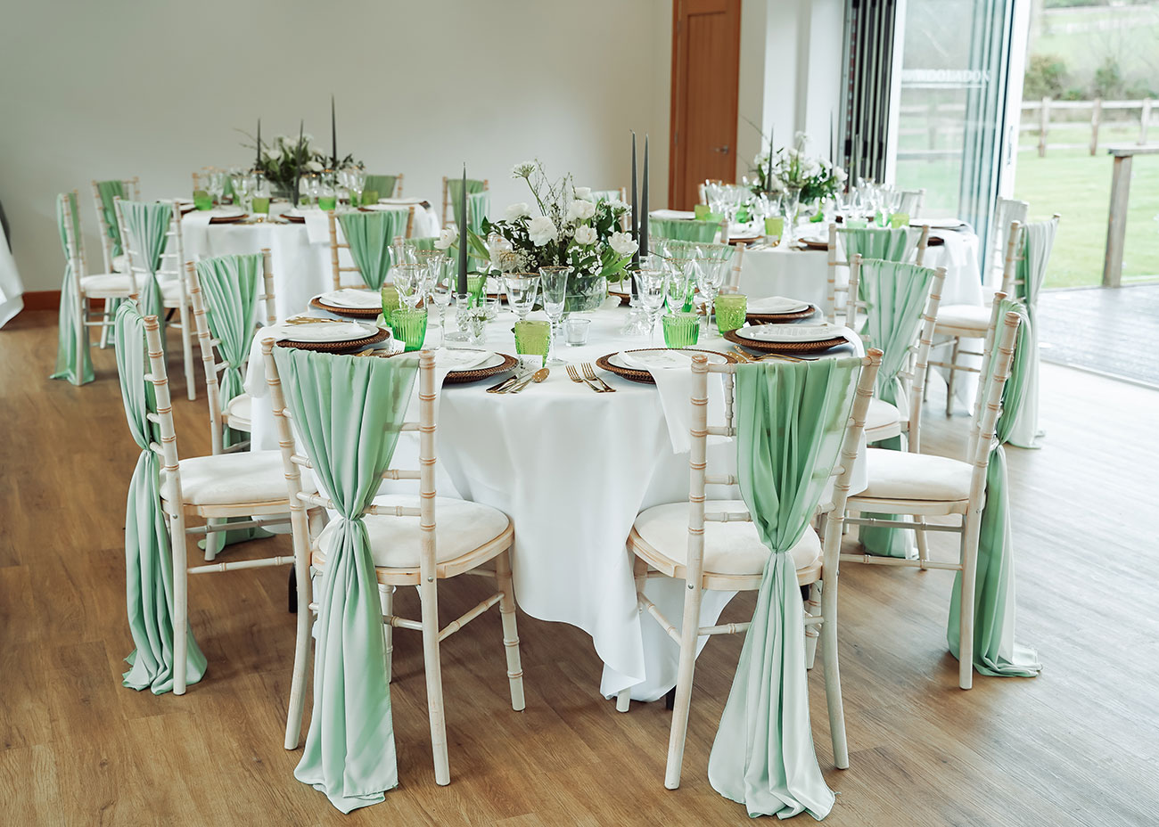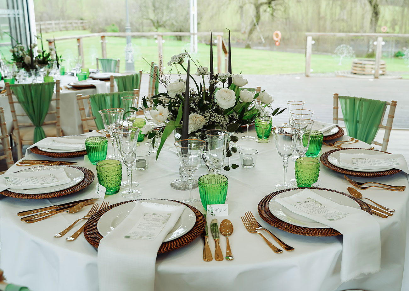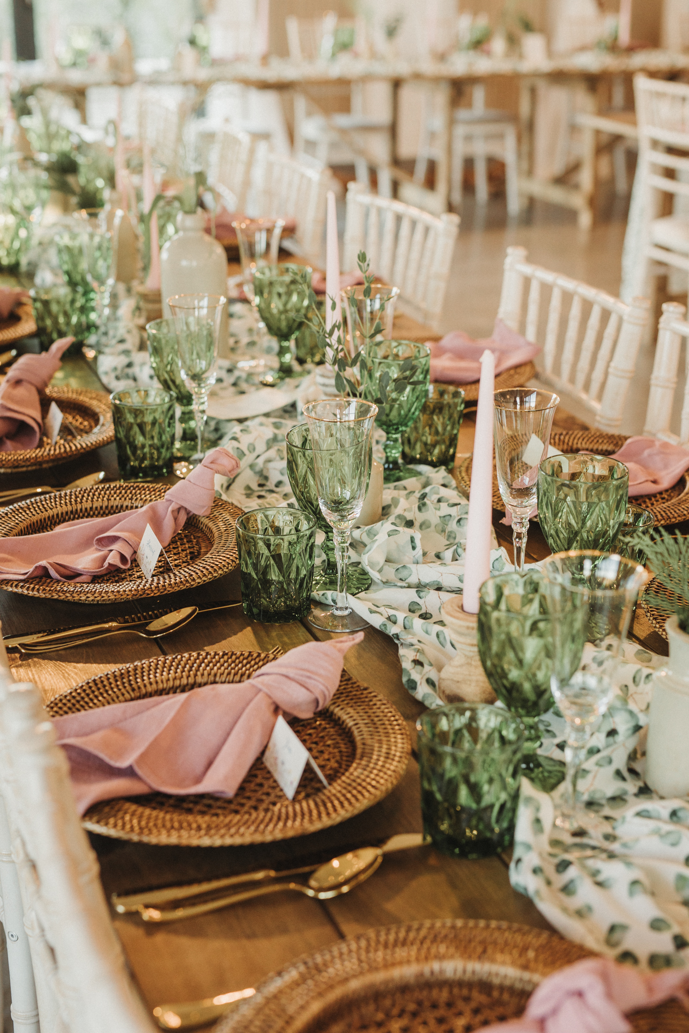 As a colour scheme, this is a twist on a more traditional wedding style. It has a quintessential wedding feel to it; think English country garden. This look works well on full-length luxe table linen or rustic wooden tables paired with a sage table runner, brass candlesticks, rattan charger plates, white crockery and oversized vintage rose napkins. It’s such a versatile style you can choose minimalistic décor with accents of colour or opt for a fuller look with layered fabrics, tall candlesticks and sculpted flower arrangements.