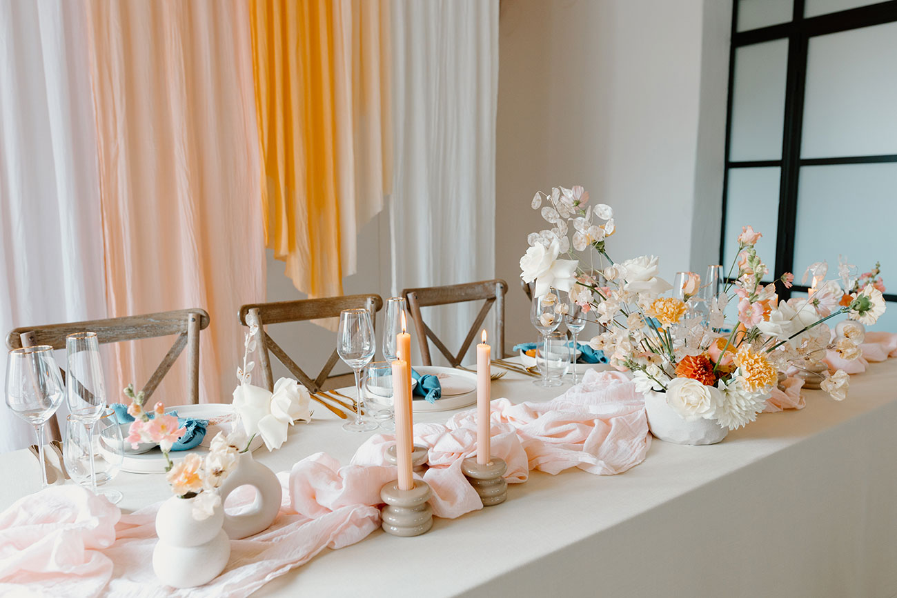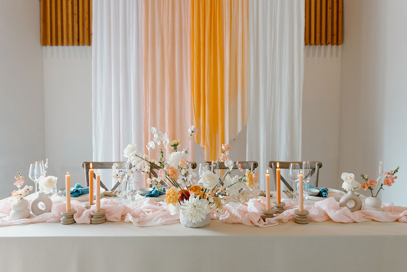 We’ll see a bright burst of sunny colours, like orange and hot pink, mixed into the stationery, bridesmaids’ dresses, ceremony flowers and wedding tablescapes. This look works beautifully for flower installations, bud-heavy table flowers and bold ceremony backdrops.