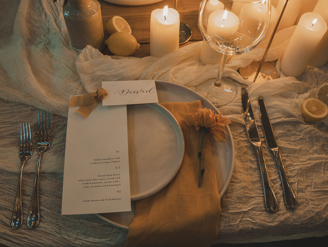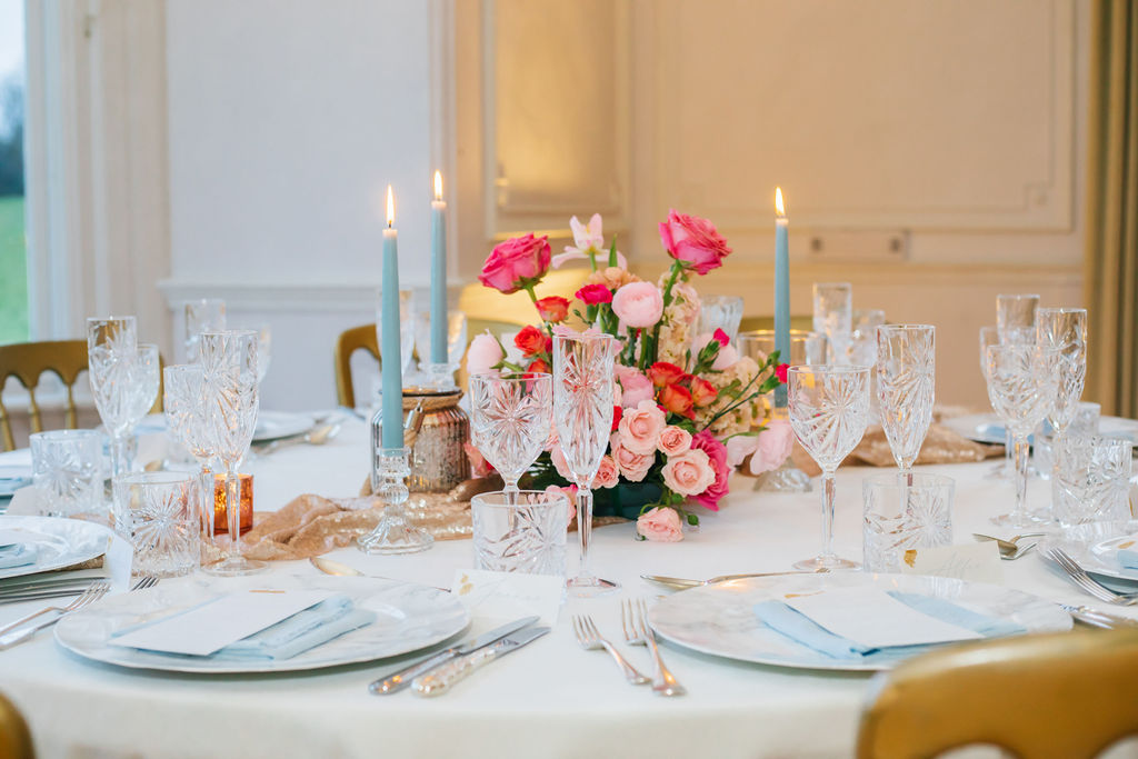 Dusty blue and pinks with soft understated fabrics, textured napkins or table runners will make for a relaxed romantic vibe complemented by fine dining touches. Think crystal glassware, delicate candlelight, vintage tableware, understated stationery with script fonts and gentle flushes of colour. Draped ceilings with plentiful layers of white fabric will bring a very romantic, timeless and classic feel.