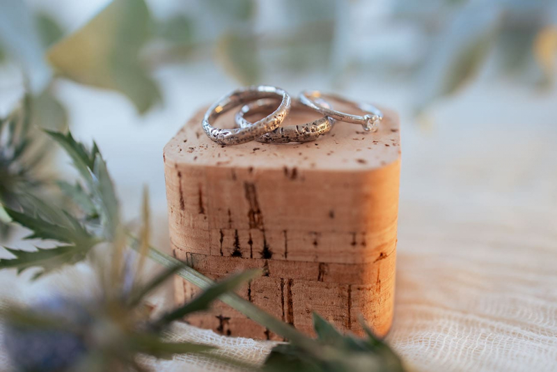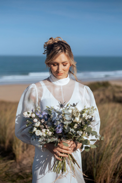 The scene is further elevated by the couple’s ensembles courtesy of a muted blue three-piece suit and sultry slip gown with high collar and sheer organza sleeves. The sea-inspired pastel colour scheme continues with the groom’s boutonniere and the bride’s bouquet, along with pared-back pew-end floral arrangements and an asymmetric arch display. The stationery enhances the elegance of the scene, while the sandcast wedding rings provide the symbolic sartorial endnote.