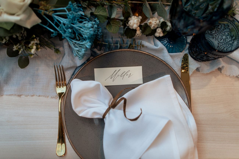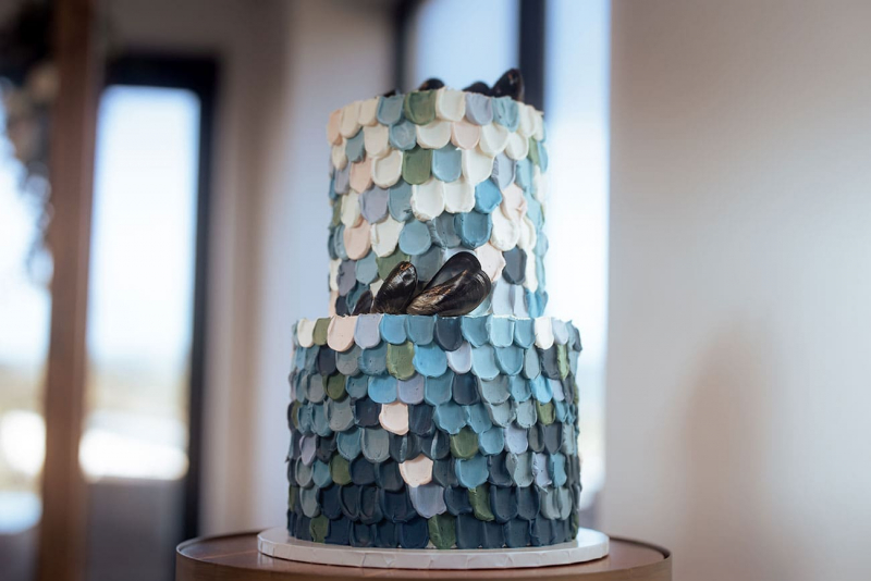 A number of elements are used to achieve the aesthetic, from brass candlesticks to textured navy glassware, clean white linens, smooth pebble-like charger plates, gold flatware and low level florals with sprigs of greenery and striking sea blues. The cake is a statement piece featuring multicoloured icing in a fishscale design complete with confection mussels, while the lighting is natural, accentuated only by the scattering of a few floor lanterns.