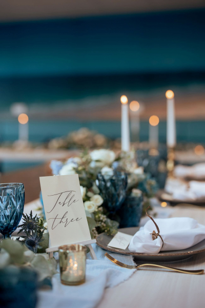 "Coast has so much natural light that it was a joy to style and dress this venue. The soft huey blues of the sky and looking out to sea, and the warm glow that sunshine creates as it reflects onto the terraces and through the skylight, made an inspiring backdrop," says coordinator and stylist Hazel Parsons from Out of the Ordinary Weddings, who styled this shoot. "The feel for the shoot was soft, coastal and relaxed yet elegant and timeless. We pulled in the colours around us to create the finished look."